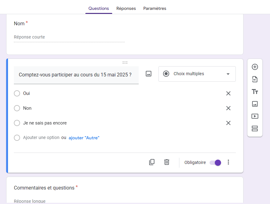 Pour gérer les inscriptions, Julie a réutilisé le formulaire qu’elle avait initialement envoyé pour sonder l’intérêt de son entourage, elle l’a modifié pour l’adapter à cette nouvelle étape. Elle a ajouté la date et le lieu du cours dans la description, et a transformé la question sur l’intérêt en une question d’engagement, demandant aux personnes si elles souhaitaient effectivement participer.