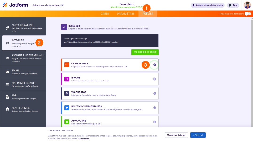 Souhaitez-vous ajouter du contenu textuel ou des codes HTML supplémentaires à votre formulaire mais en dehors de Générateur de Formulaires Jotform? Souhaitez-vous héberger les fichiers du formulaire sur votre propre serveur? Si oui, cela est possible en intégrant votre formulaire à l’aide de notre méthode des codes sources. Voici les étapes: