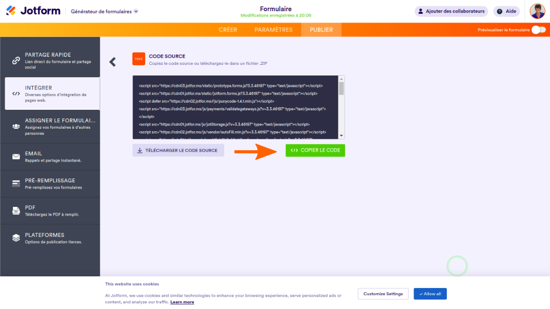 - Cliquez sur le bouton Copier le code pour copier les codes sources du formulaire