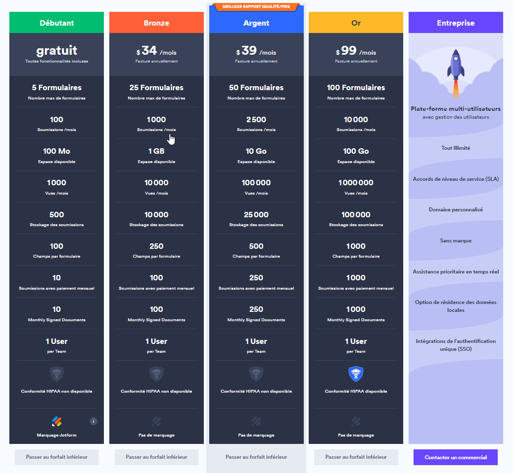 Si vous avez un compte gratuit, déterminez le nombre de soumissions régulières, de soumissions de paiement, de stockage de fichiers et de formulaires dont vous aurez besoin. Ce sont les principales limites de chaque plan. Si vous avez besoin de plus de 100 soumissions, mais pas plus de 1 000, la formule Bronze vous suffira. Cependant, si vous avez besoin de plus de 25 formulaires, la formule Argent est une meilleure option.