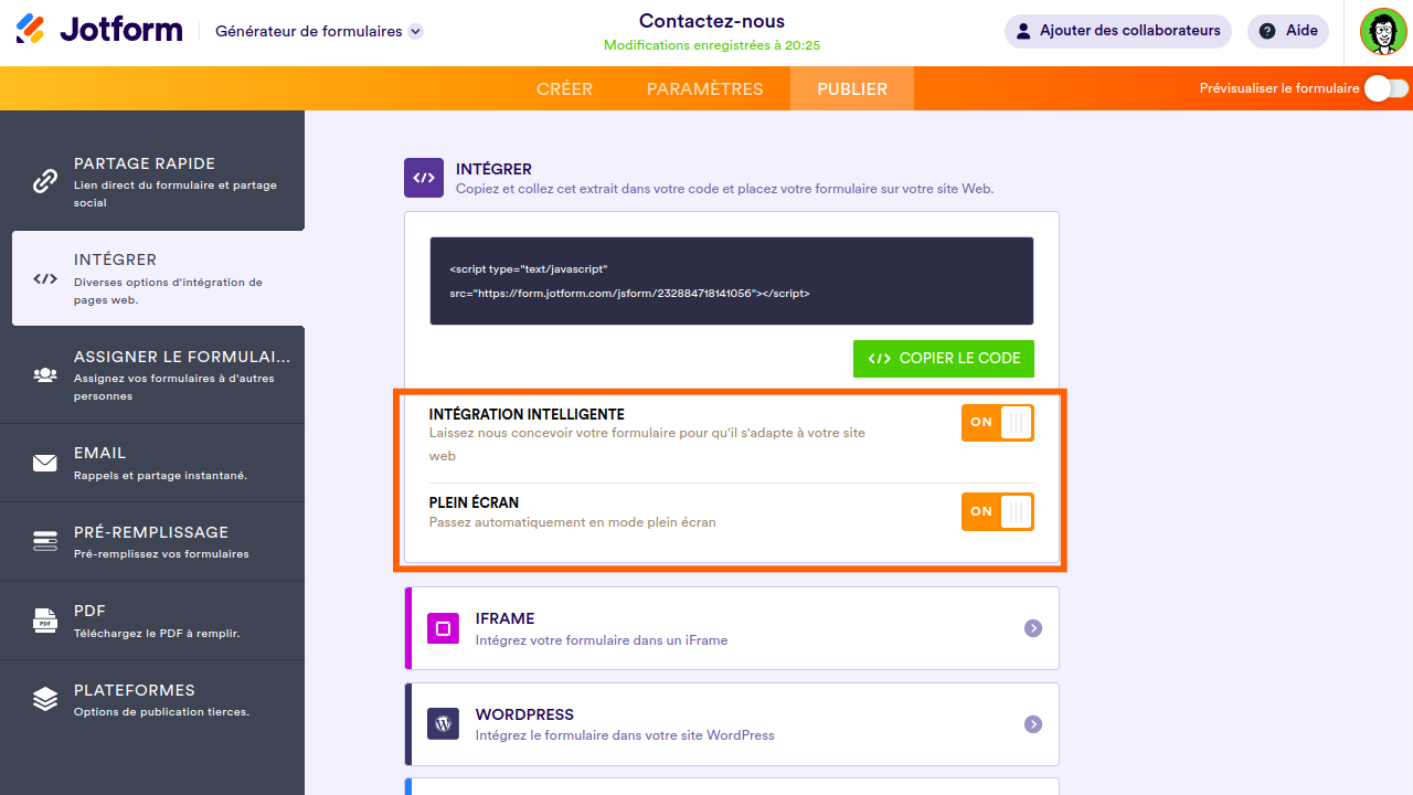 Ce nouveau code d’intégration peut être trouvé dans l’onglet Publier du Générateur de Formulaires. La méthode d’intégration du bouton de feedback flottant placera un bouton dans n’importe quel coin de votre page web. Vous pouvez également personnaliser le bouton selon vos préférences.