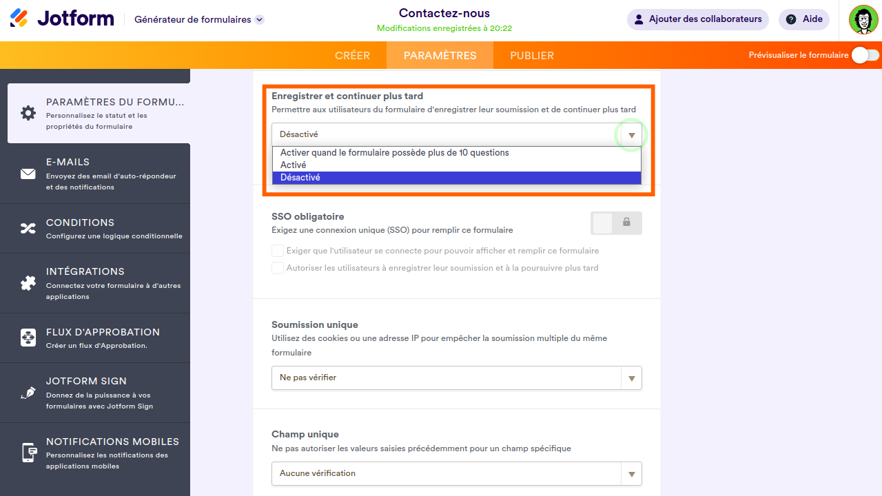 - Activer lorsque le formulaire compte plus de 10 questions – c’est l’option par défaut. Elle enregistre la progression de l’utilisateur une fois que le formulaire comporte plus de 10 champs.