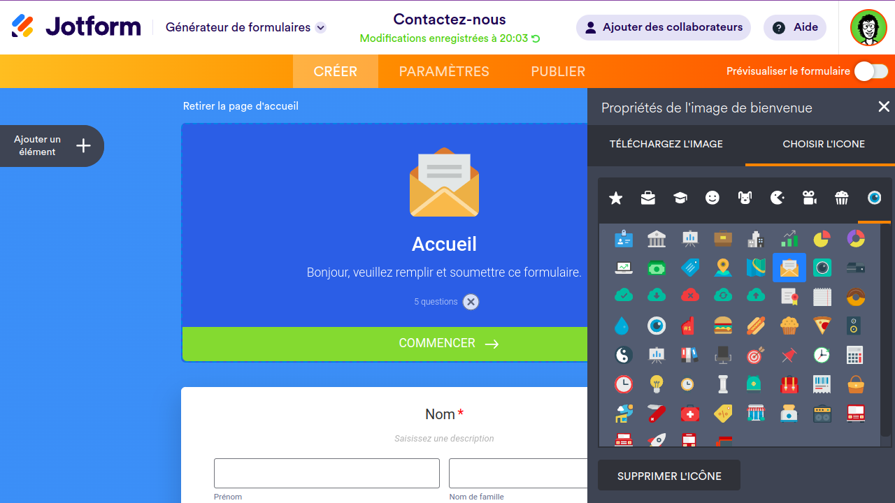 En haut du Générateur de Formulaires, vous verrez un bouton Modifier la page de bienvenue. Cela vous permettra de personnaliser les textes affichés sur la première page, de changer l’icône utilisée, d’afficher ou de masquer le nombre de questions dans l’ensemble de votre formulaire, ou de supprimer entièrement la page de bienvenue.