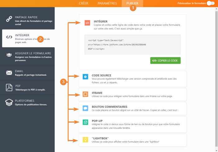 L’intégration de votre formulaire sur un site internet est cruciale pour collecter des données en continu. Pour obtenir vos codes d’intégration, cliquez sur PUBLIER en haut, puis sur INTÉGRER dans le panneau de navigation sur la gauche. Choisissez une option d’intégration différente en fonction de ce qui vous convient le mieux.