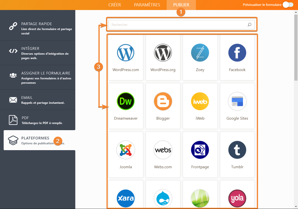 Il existe également des moyens spécifiques d’incorporer le formulaire sur différents générateurs de sites internet et plateformes CMS. Si vous en utilisez un, allez dans le menu PLATEFORMES et choisissez la plateforme que vous utilisez.