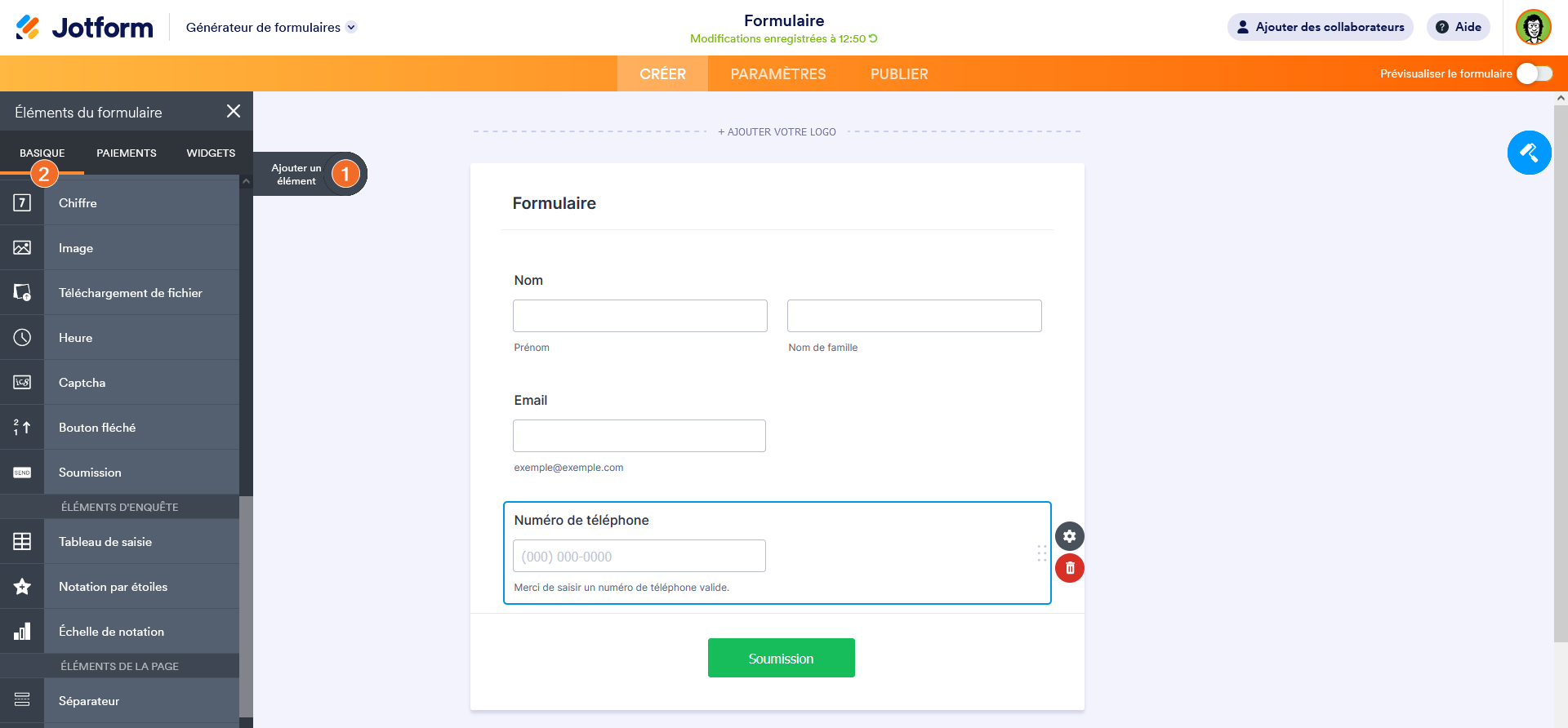 Demandez à vos visiteurs leurs noms et adresses email afin de pouvoir suivre les soumissions faites sur votre formulaire et d’avoir la possibilité de pouvoir recontacter vos visiteurs. Cliquez sur AJOUTER UN ÉLÉMENT à gauche du générateur de formulaires. Tous les champs standards du formulaire apparaissent sous l’onglet BASIQUE.