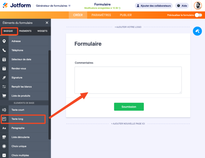 Une boite de commentaires permet aux visiteurs de fournir des réponses plus longues. Utilisez le Champ Texte Long (zone de texte) sous la section ÉLÉMENTS DE BASE de l’onglet BASIQUE.