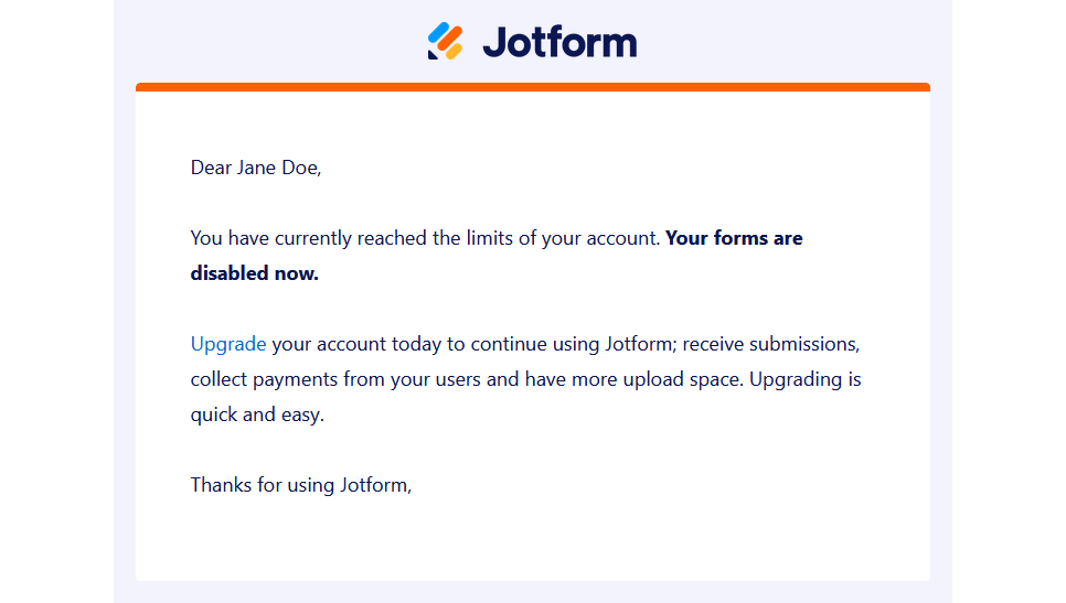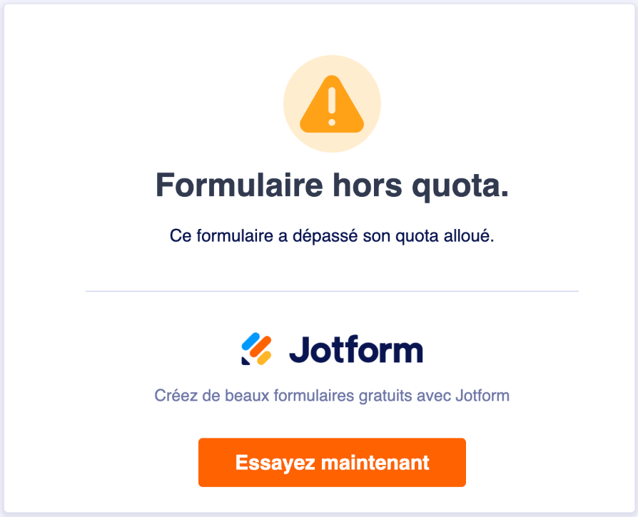 Lorsque vous atteignez les limites d’espace de téléchargement, ou l’une des limites mensuelles sur votre compte, vos formulaires seront désactivés. Vos formulaires afficheront également le message « Formulaires hors quota ».