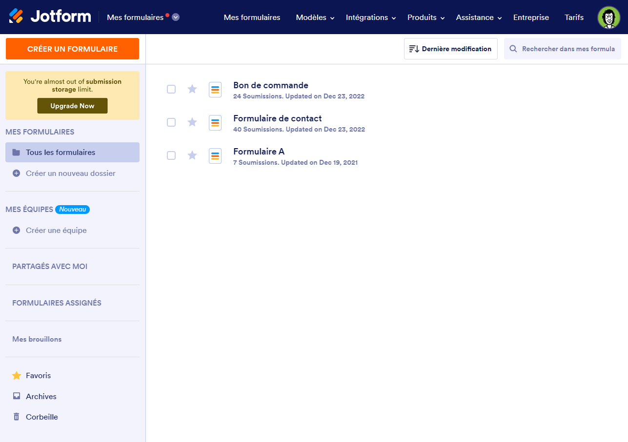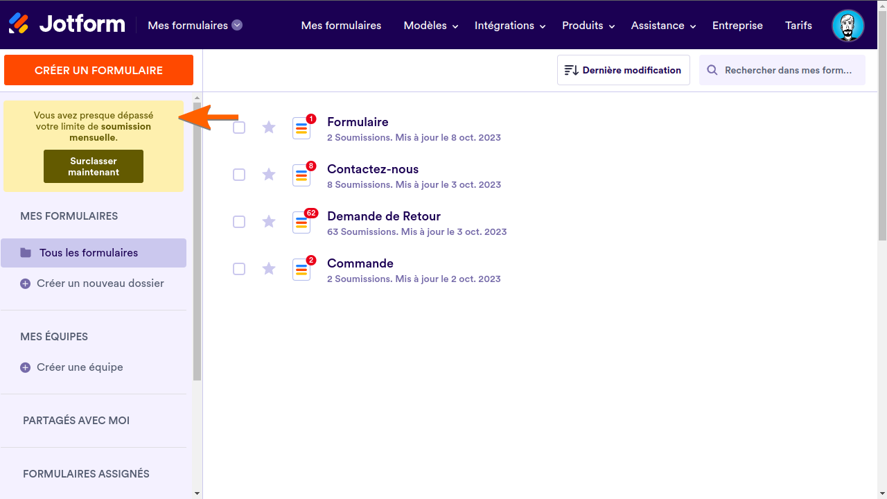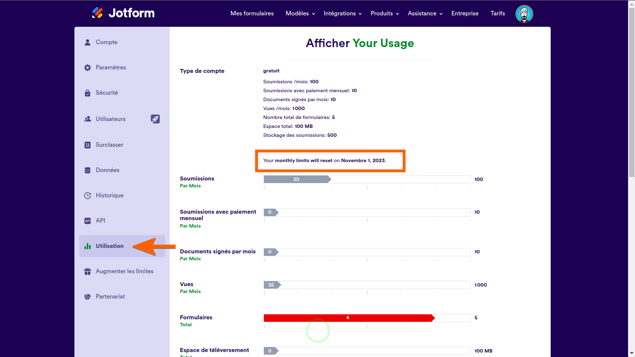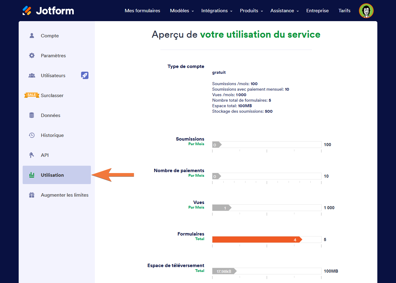 Lorsque vous êtes connecté à votre compte Jotform, vous pouvez afficher votre utilisation actuelle en cliquant sur votre avatar dans le coin supérieur droit de la page.