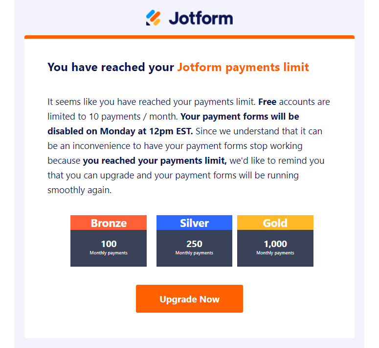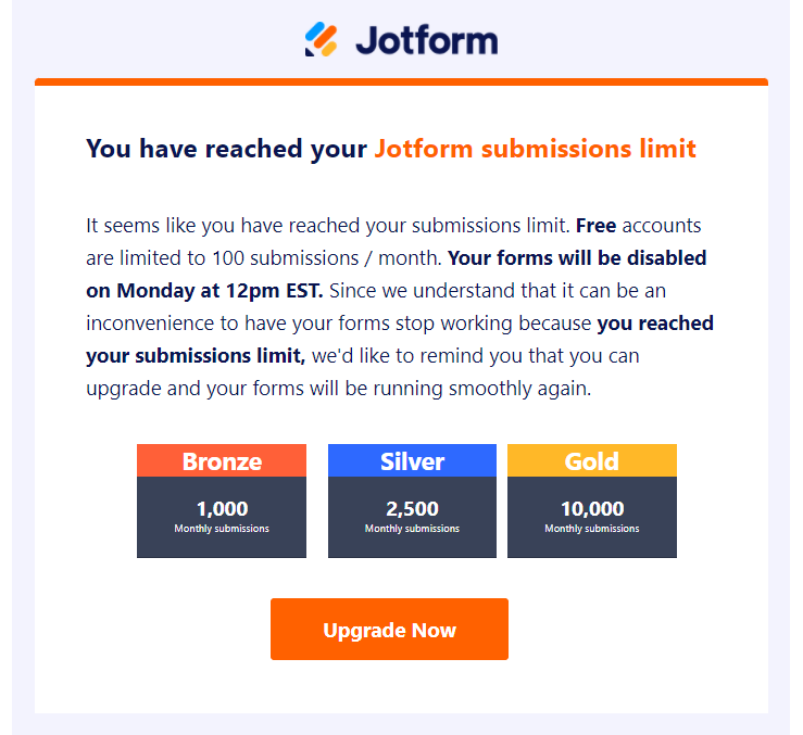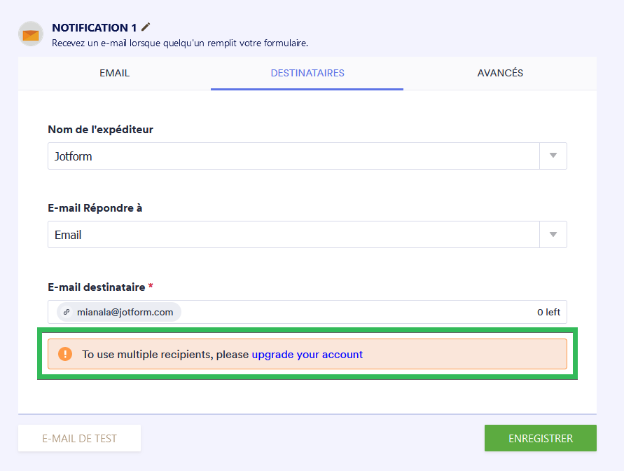 Remarque : le dépassement de cette limite supprime l’entrée de formulaire la plus ancienne pour faire de la place pour la nouvelle soumission. Pour éviter de perdre des données, vous pouvez consulter notre guide expliquant comment télécharger les soumissions de votre formulaire. - Notification par e-mail : Cette limite est unique au plan de base gratuit où une seule notification par email et un seul destinataire peuvent être utilisés. Pour plus de détails, vous pouvez suivre notre guide expliquant l’envoi de notifications à plusieurs destinataires.
