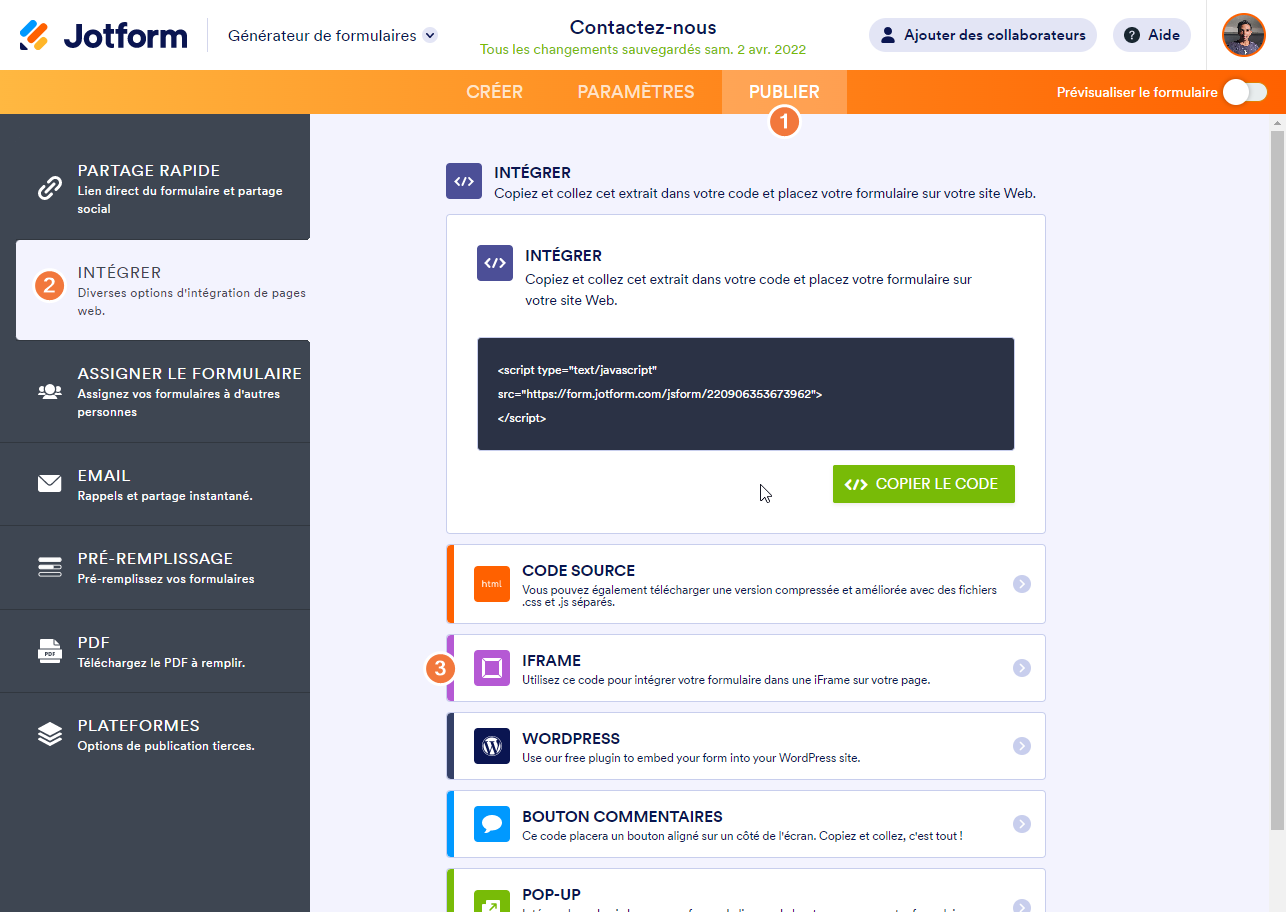 Pour obtenir le code iFrame de votre formulaire :