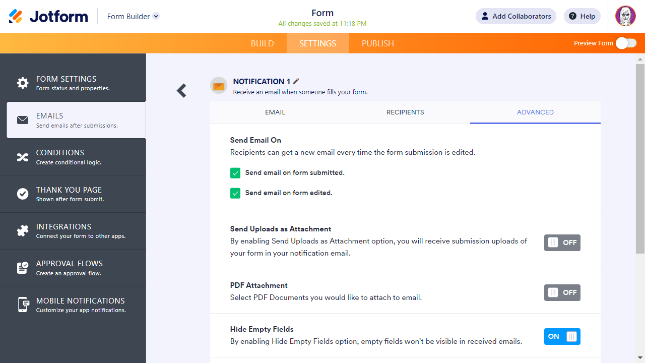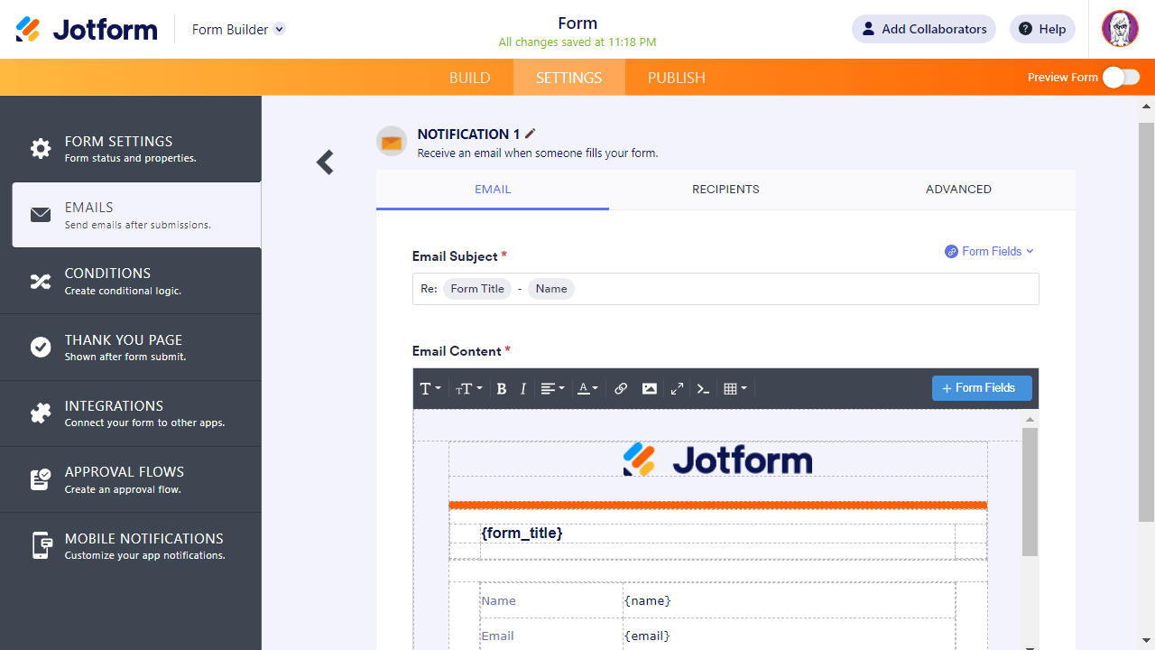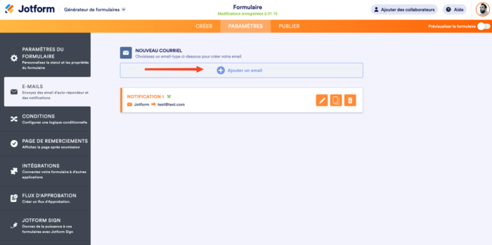 Jotform dispose de deux sortes d’alertes par email que vous pouvez configurer, l’email de notification et l’email de réponse automatique.