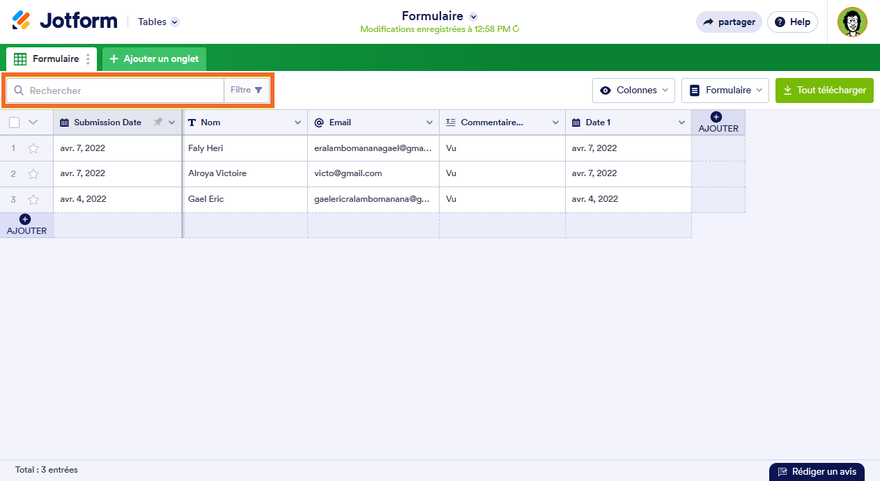- Cliquez sur le bouton Soumissions pour ouvrir Tableaux Jotform.
