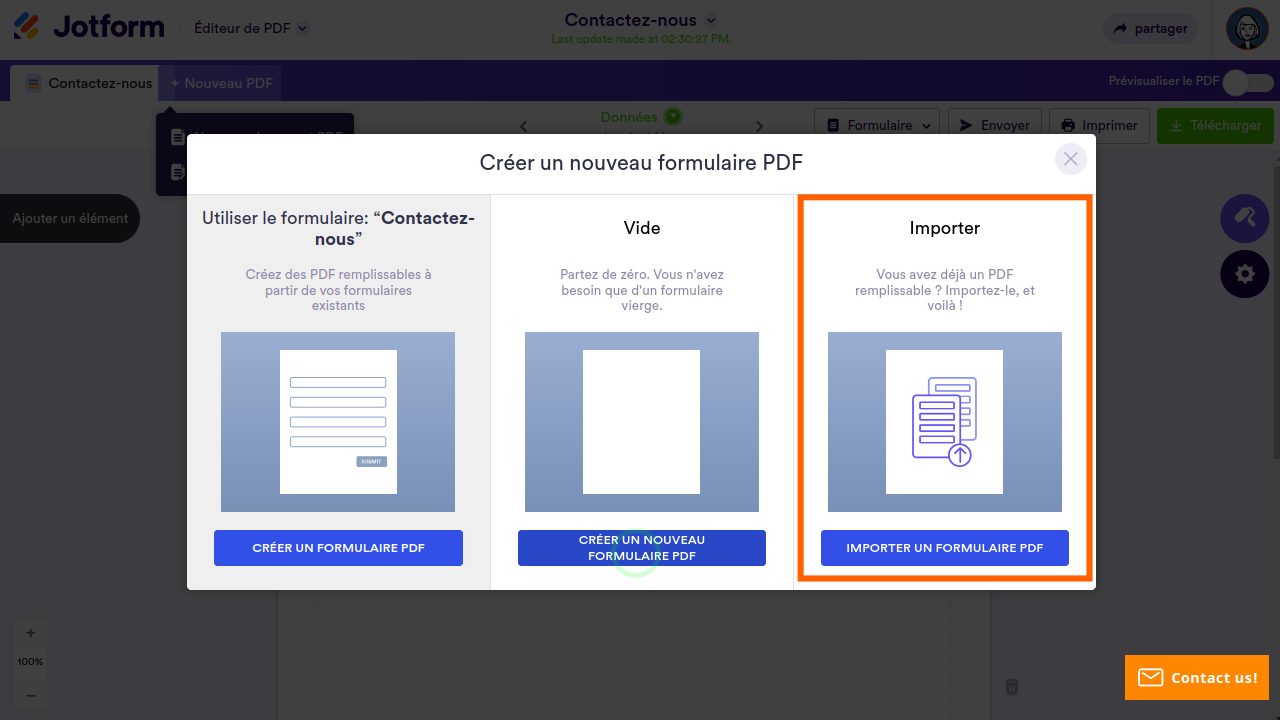 En suivant la même procédure que ci-dessus, au lieu de commencer par un modèle vierge, vous pouvez également importer votre propre formulaire PDF remplissable. Cette fois-ci, cliquez sur le bouton Importer un formulaire PDF.