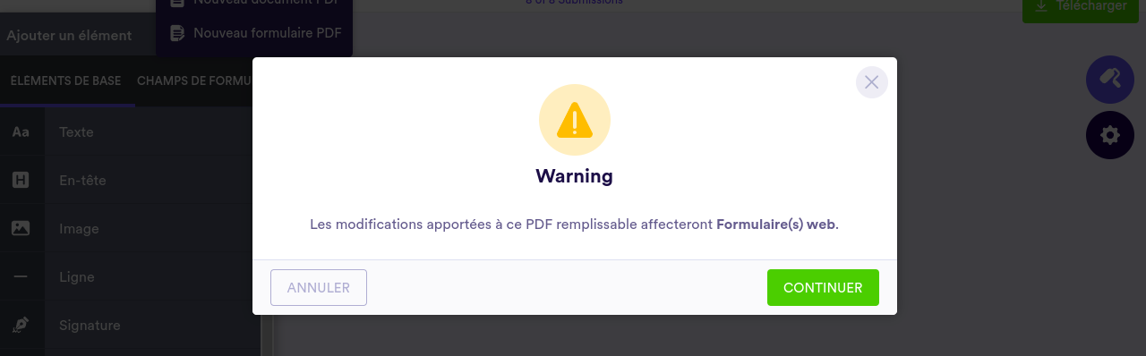 Une fois que vous avez ouvert la page de l’Éditeur PDF, une fenêtre contextuelle d’avertissement s’affiche :