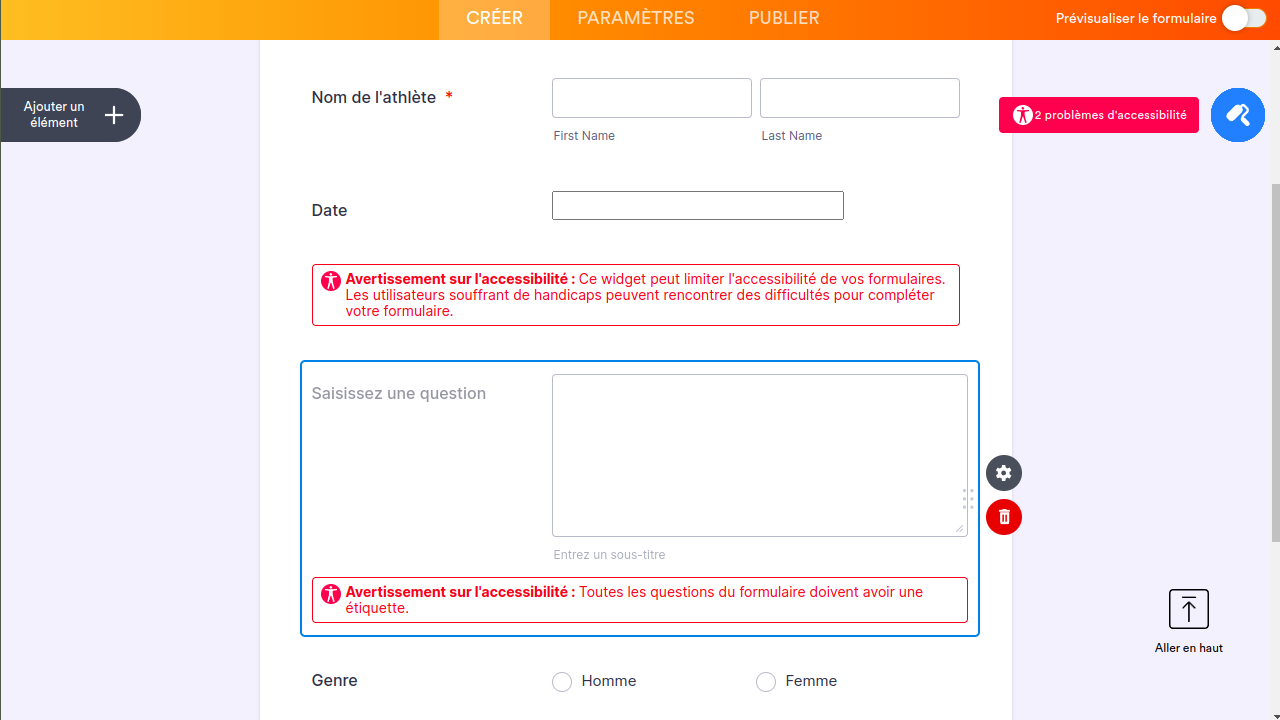 Notre générateur de formulaire analysera le formulaire et, si des problèmes d’accessibilité sont détectés, vous avertira des aspects à corriger pour rendre le formulaire accessible. Par exemple, s’il n’y a pas assez de contraste, si un champ manque n’a pas d’étiquette, si une image n’a pas de texte alternatif, si un widget non pris en charge est utilisé ou si d’autres problèmes détectés, vous verrez des avertissements dans l’éditeur.