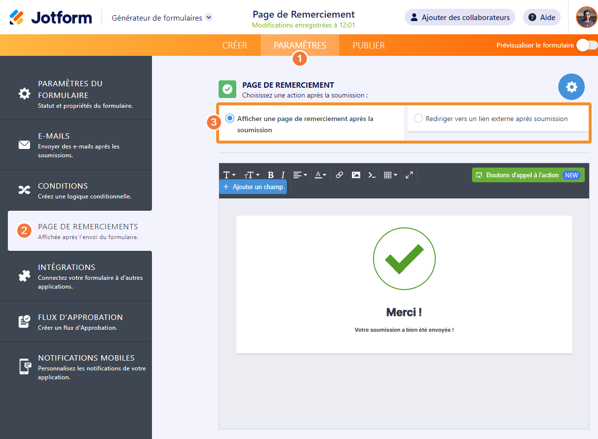 Ce guide est pour la mise les formulaires classique. Si votre formulaire est en disposition de carte, consultez Comment modifier la page de remerciement dans les formulaires Carte.