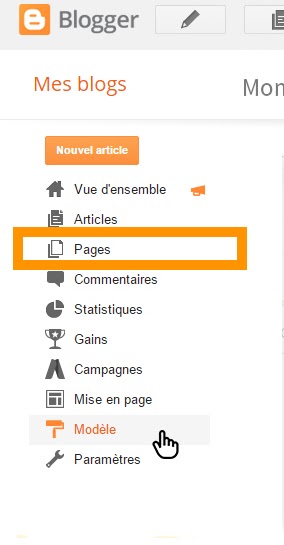 - Dans votre dashboardBlogger, choissez Pages sur la gauche.