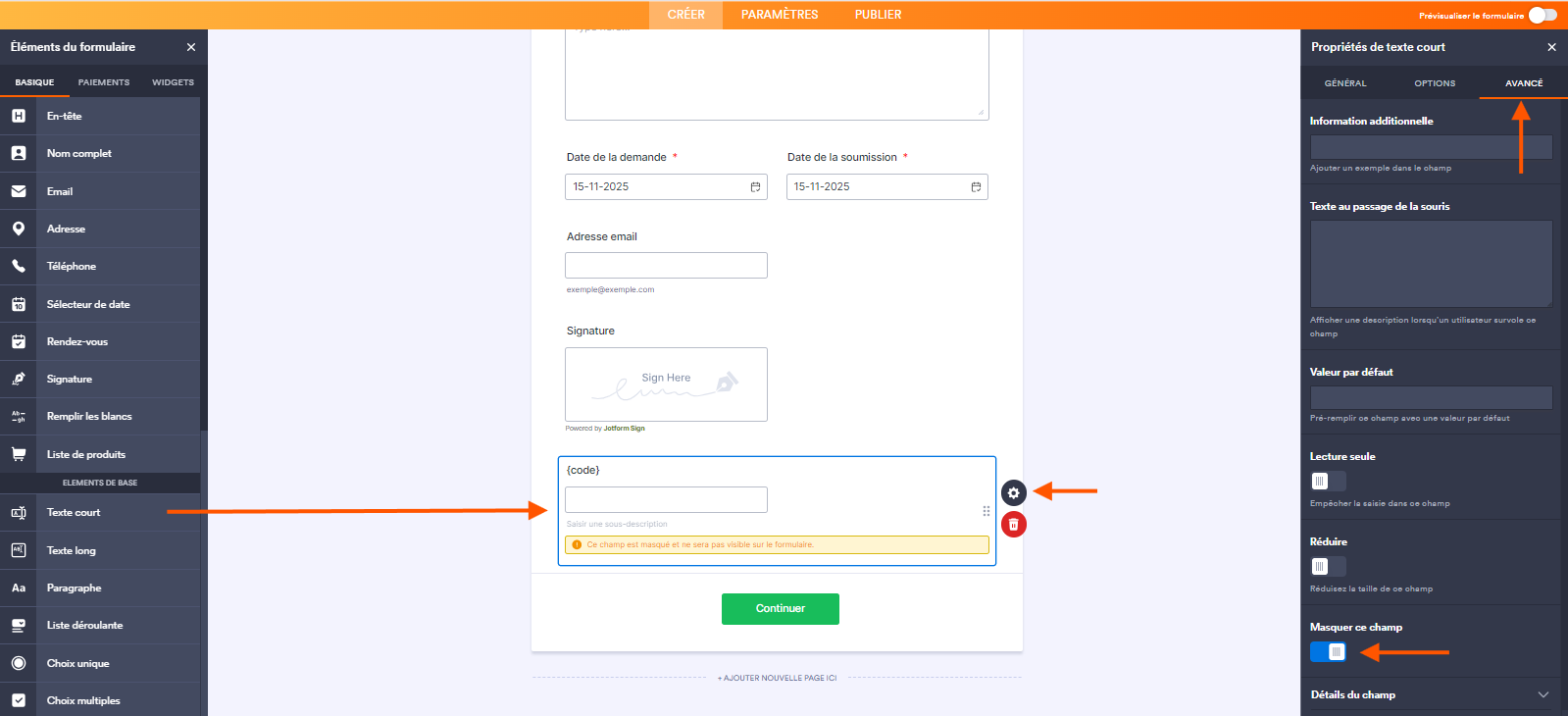 Tout d’abord, accédez à votre formulaire dans le Générateur de formulaires Jotform et ajoutez-y un champ Texte court. Masquez-le et renommez-le en « code » ({code} pour être précis, comme illustré dans les images ci-dessous).