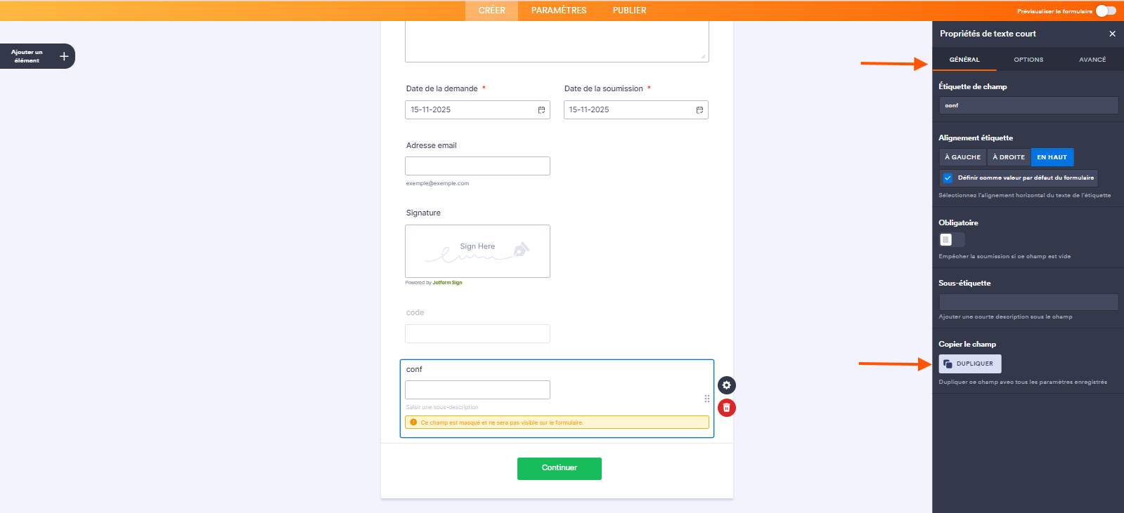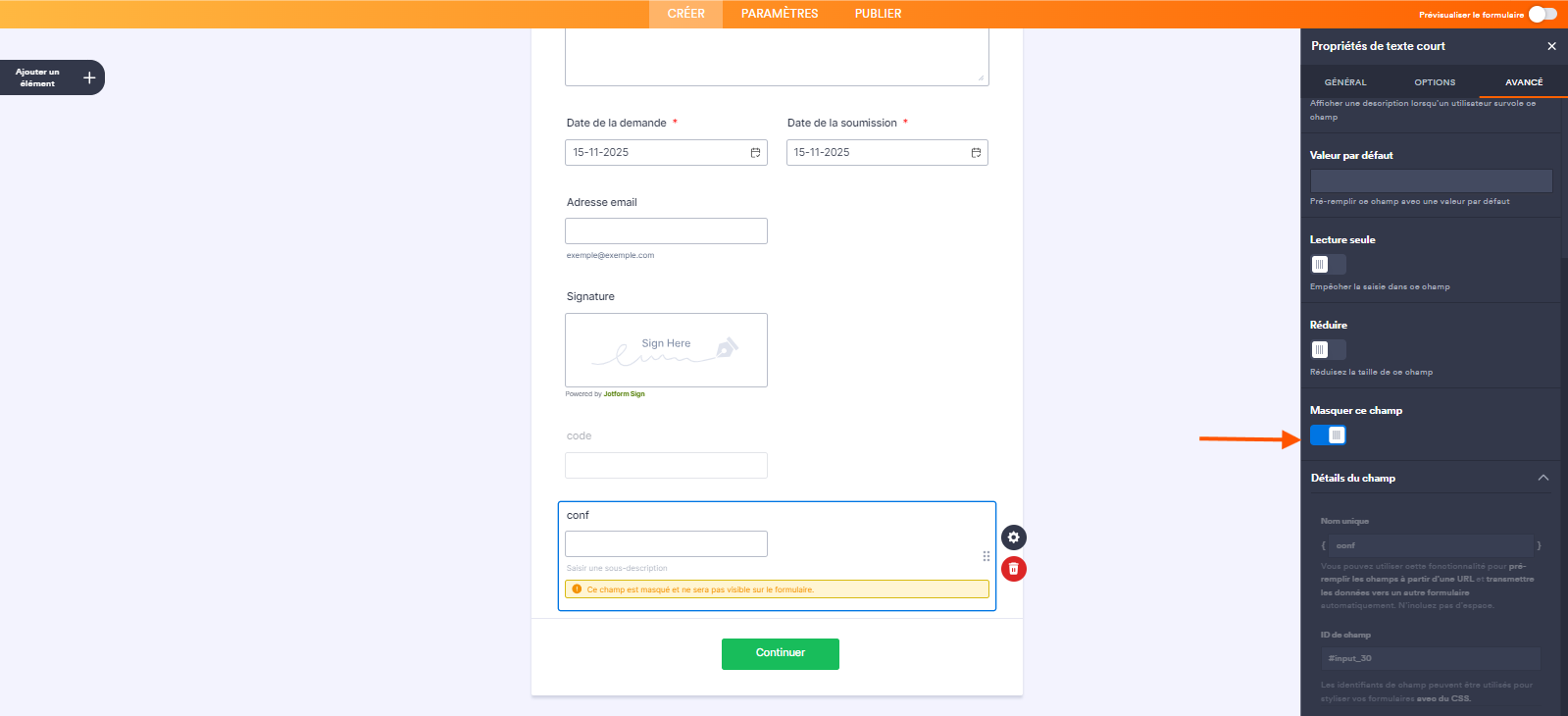 Vous avez donc maintenant 2 champs sur votre formulaire Jotform : code et conf. Vous devez vérifier que vous les avez masqués tous les deux. Pour cela, vérifier que vous avez activé le bouton Masquer ce champ.