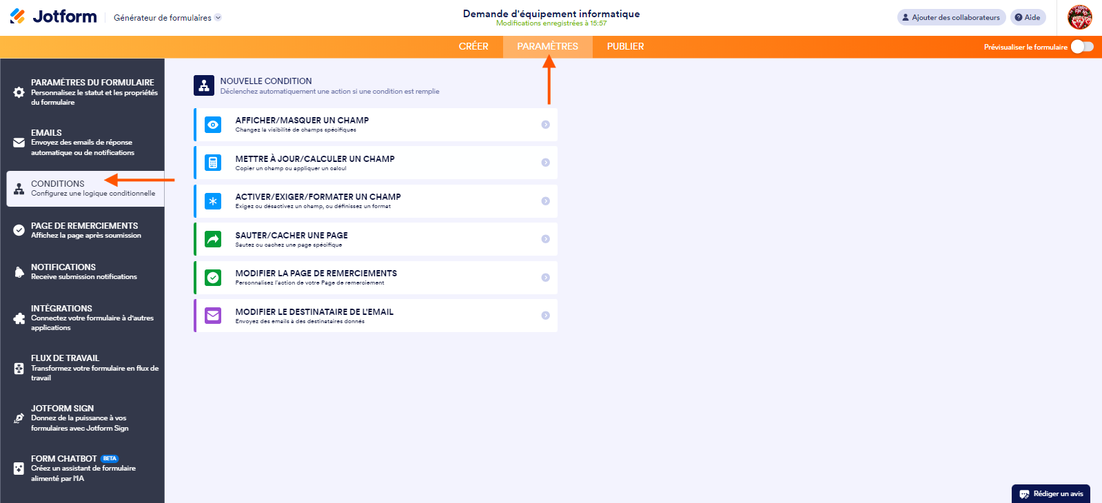 5. Accédez à l’onglet Conditions en cliquant sur l’onglet Paramètres du formulaire.