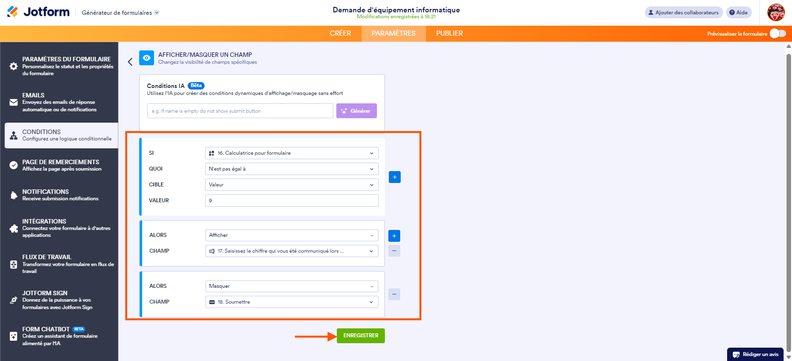 Cliquez sur Afficher/Masquer un champ dans la liste des options de la page Nouvelle condition. Définissez les conditions qui permettront de vérifier si le widget Calculatrice de formulaire configuré précédemment fournit le résultat mathématique que vous souhaitez. Cliquez sur le bouton Enregistrer.