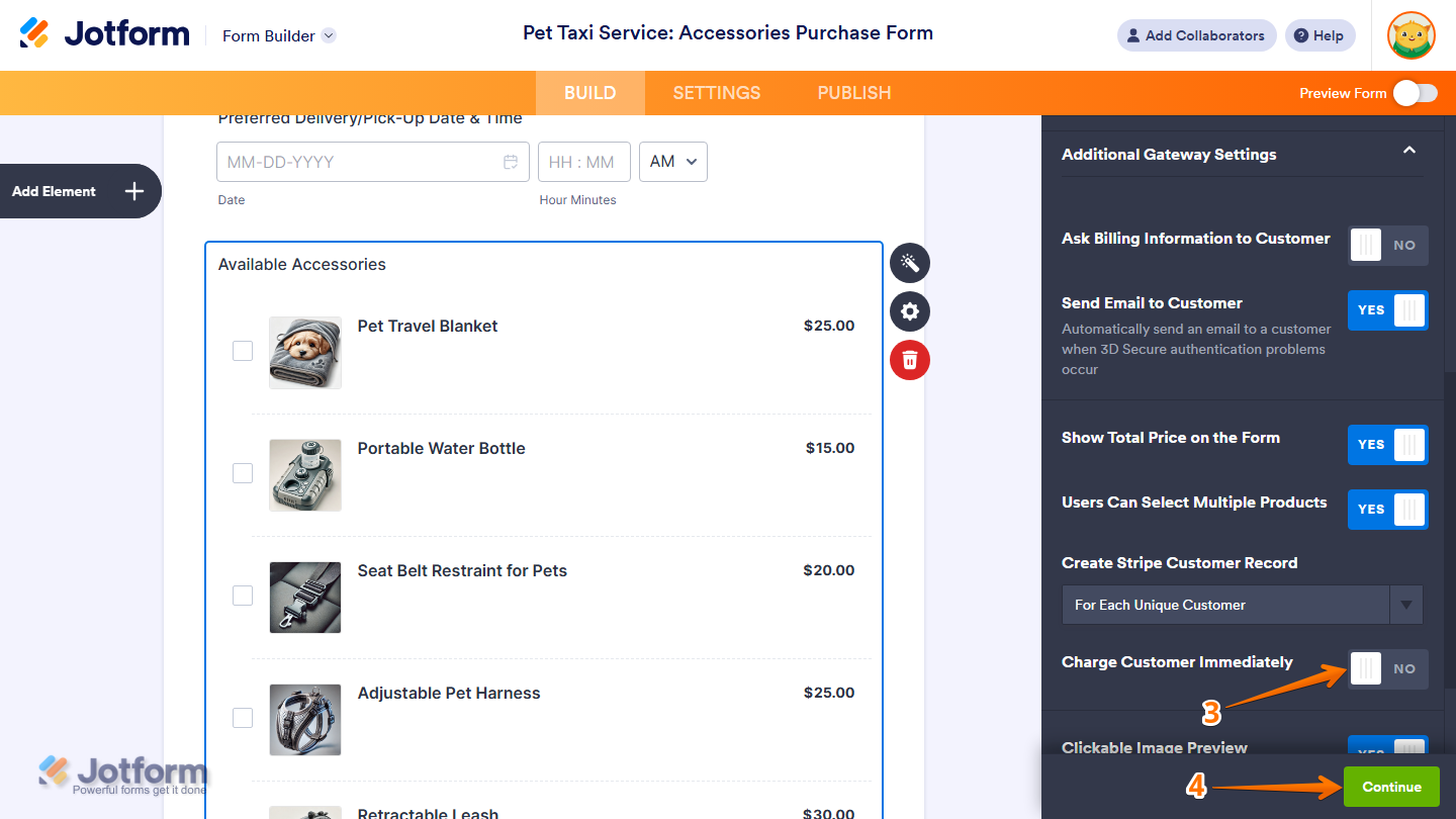 Grâce à l’intégration de Stripe avec Jotform, vous pouvez facilement activer l’autorisation de paiement : un processus en deux étapes qui vous permet de bloquer des fonds et de les débiter ultérieurement. C’est particulièrement utile pour confirmer un stock, planifier une intervention ou effectuer des étapes supplémentaires avant de finaliser une vente. En bloquant les paiements au lieu de les traiter immédiatement, vous gagnez en flexibilité et en contrôle sur les modalités et le moment de facturation de vos clients.