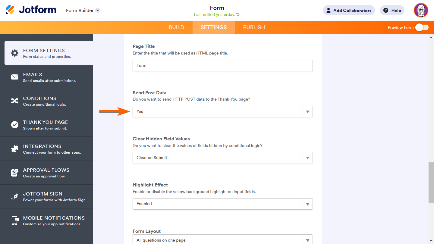 L’option “Envoyer les données POST dans le Générateur de formulaire vous permet d’envoyer les données de votre formulaire vers une URL de destination via une requête HTTP POST. Vous pouvez utiliser https://www.jotform.com/show-post-data/ comme URL de destination pour afficher vos soumissions en tant que données POST à des fins de débogage.