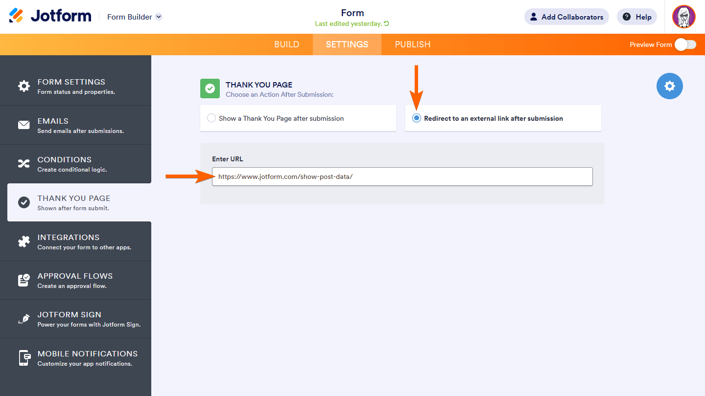 - Saisissez https://www.jotform.com/show-post-data/ comme URL de destination.
