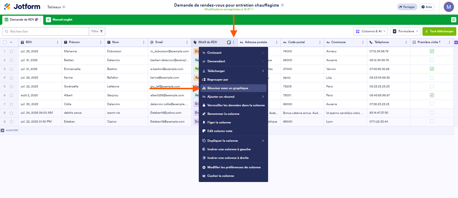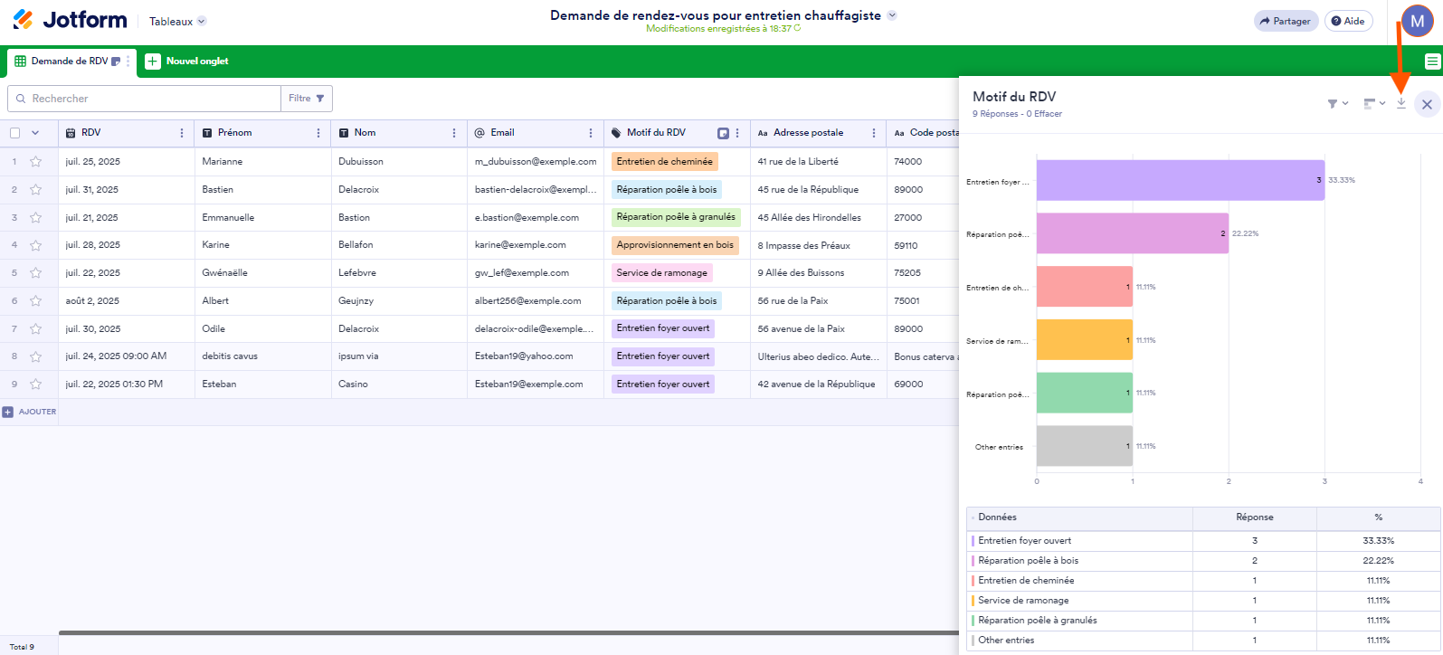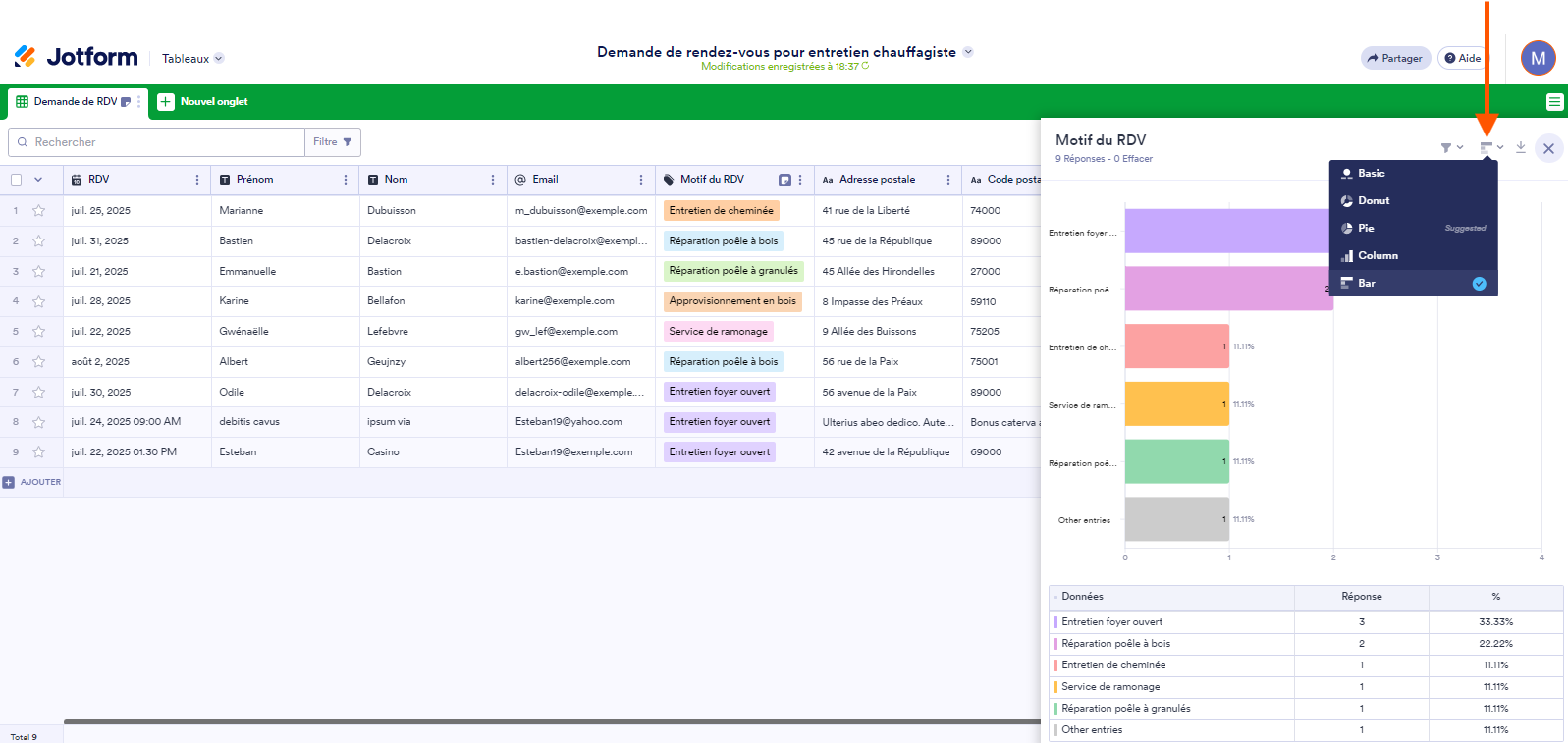 Bien que vous puissiez créer un rapport visuel pour vérifier combien de réponses vous avez reçues à certaines questions de formulaire, la fonctionnalité Résumer avec un graphique dans les Tableaux Jotform vous permet d’obtenir ces chiffres en quelques clics.