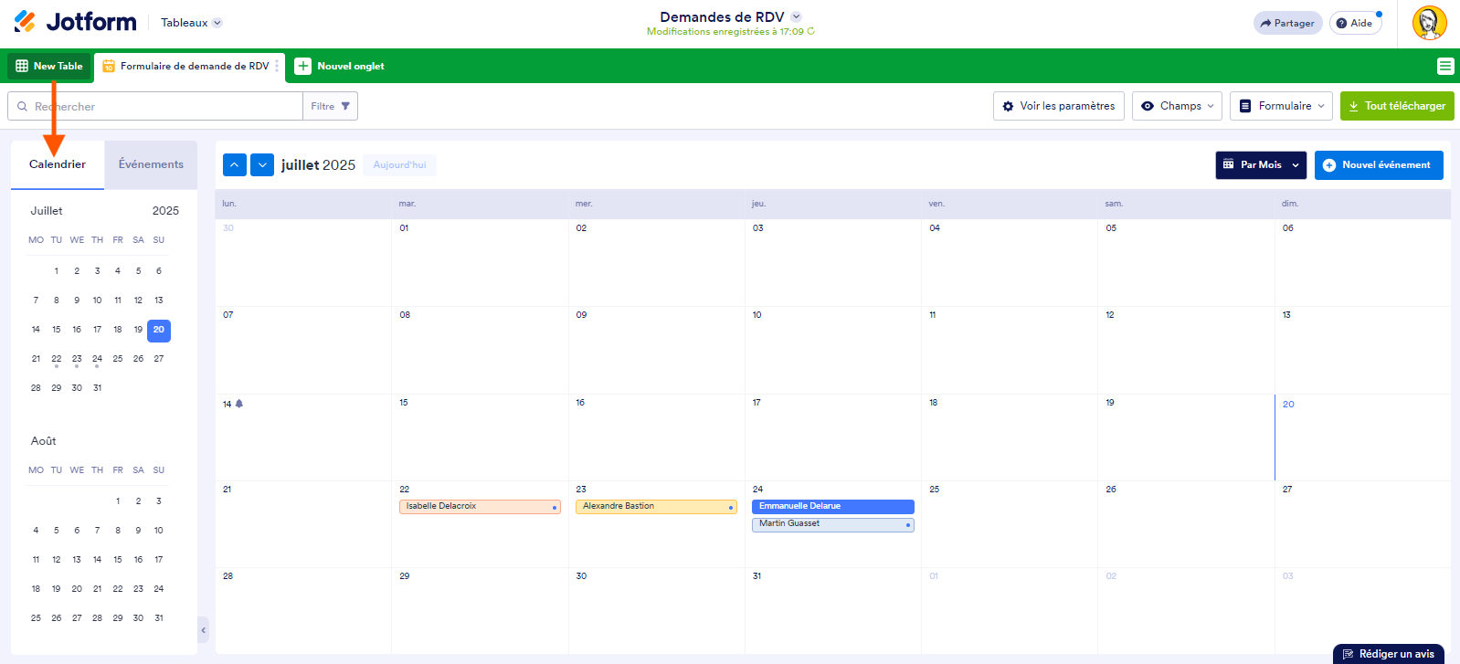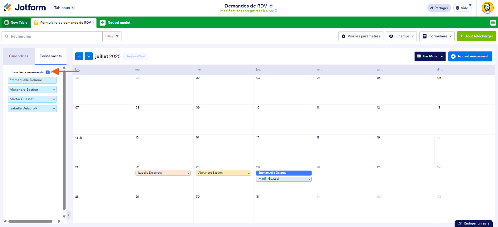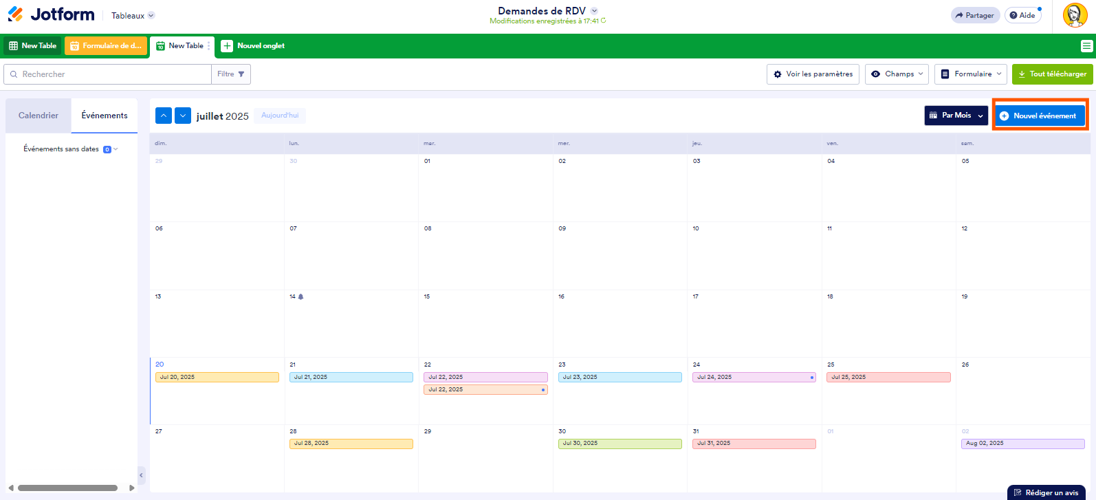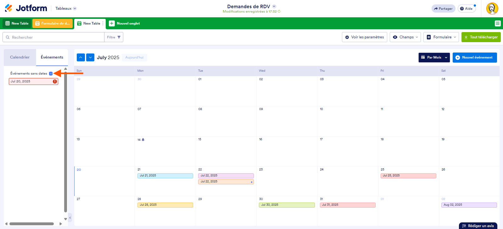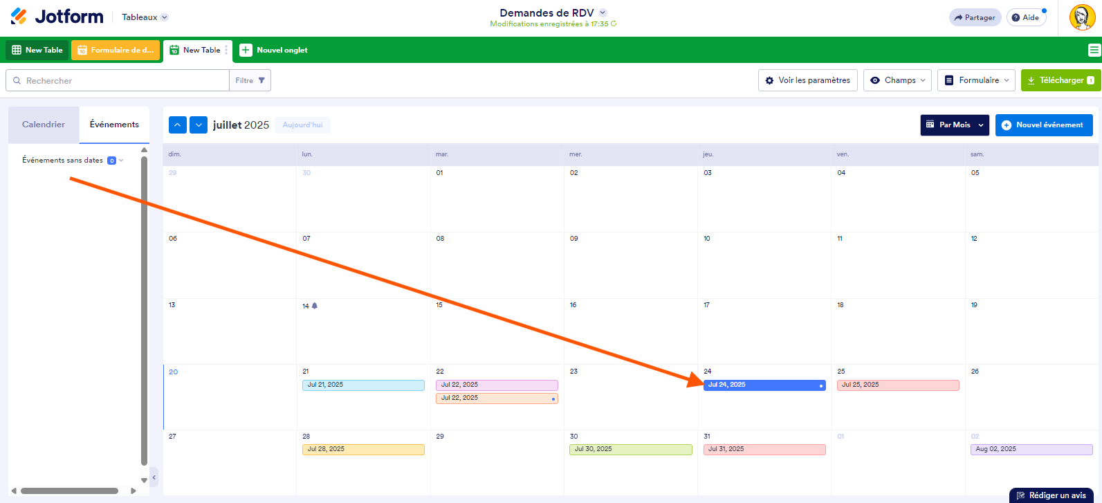Vous pouvez ajouter un nouvel onglet dans les Tableaux Jotform qui vous permet de répertorier vos soumissions de formulaire en événements et de les afficher dans un calendrier. Voici comment procéder :