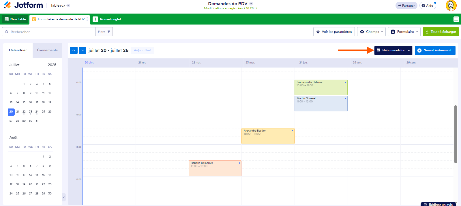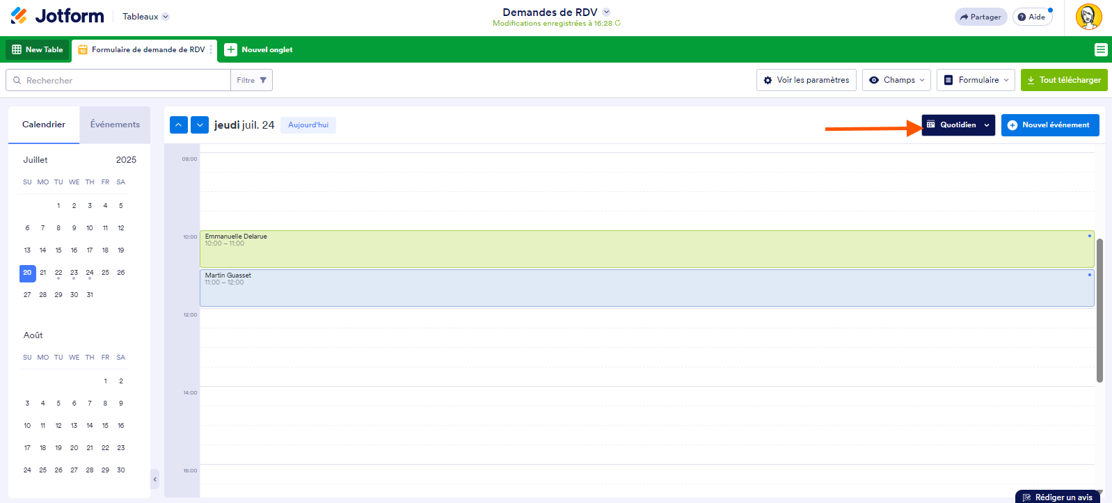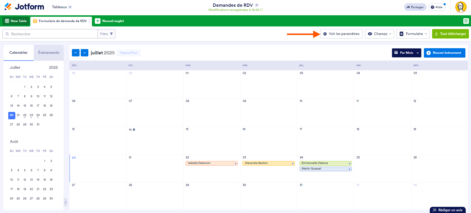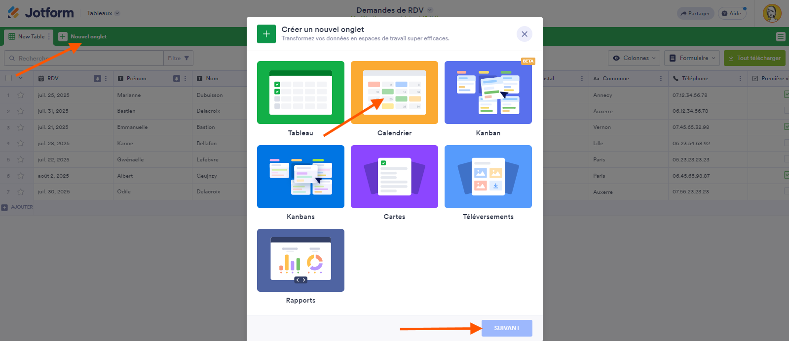 Vous pouvez ajouter un nouvel onglet dans les Tableaux Jotform qui vous permet de répertorier vos soumissions de formulaire en événements et de les afficher dans un calendrier. Voici comment procéder :