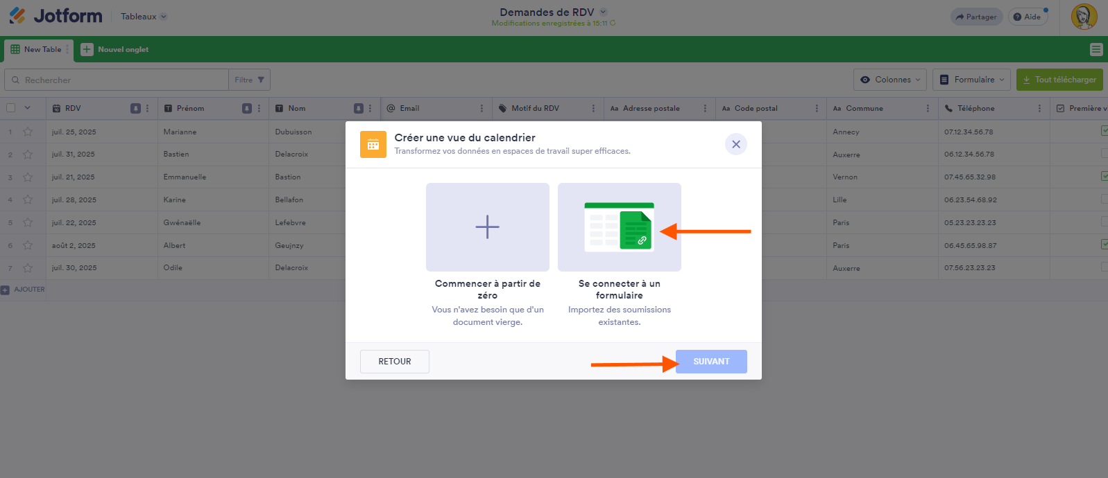 - Dans la fenêtre Créer une vue du calendrier, choisissez entre l’option Commencer à partir de zéro, pour créer un calendrier vierge et ajouter des événements manuellement, et l’option Se connecter à un formulaire, pour téléverser des soumissions de formulaire existantes dans votre calendrier. Pour notre exemple, nous sélectionnons Se connecter à un formulaire.