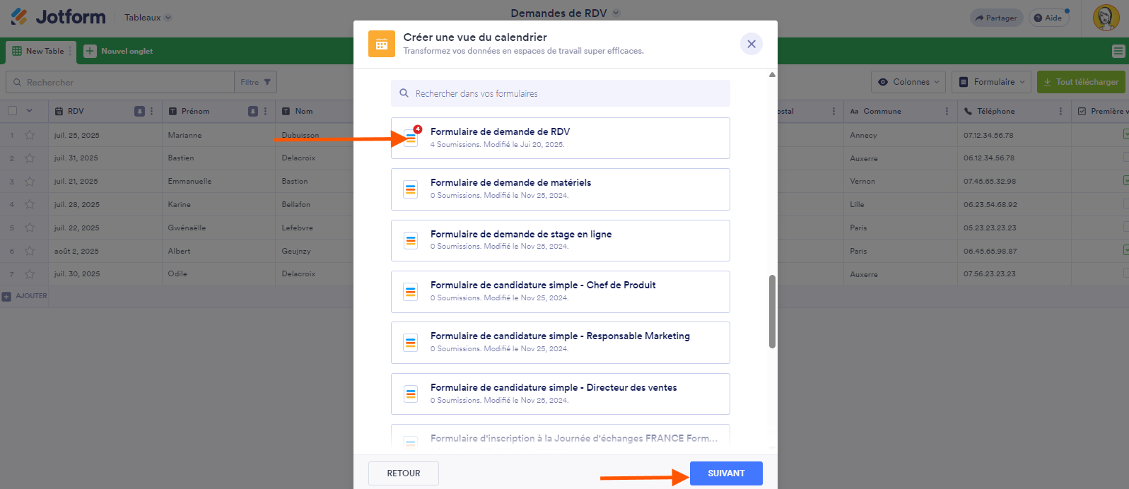 - Dans la liste des formulaires qui s’affiche, recherchez et sélectionnez votre formulaire, puis cliquez à nouveau sur Suivant.
