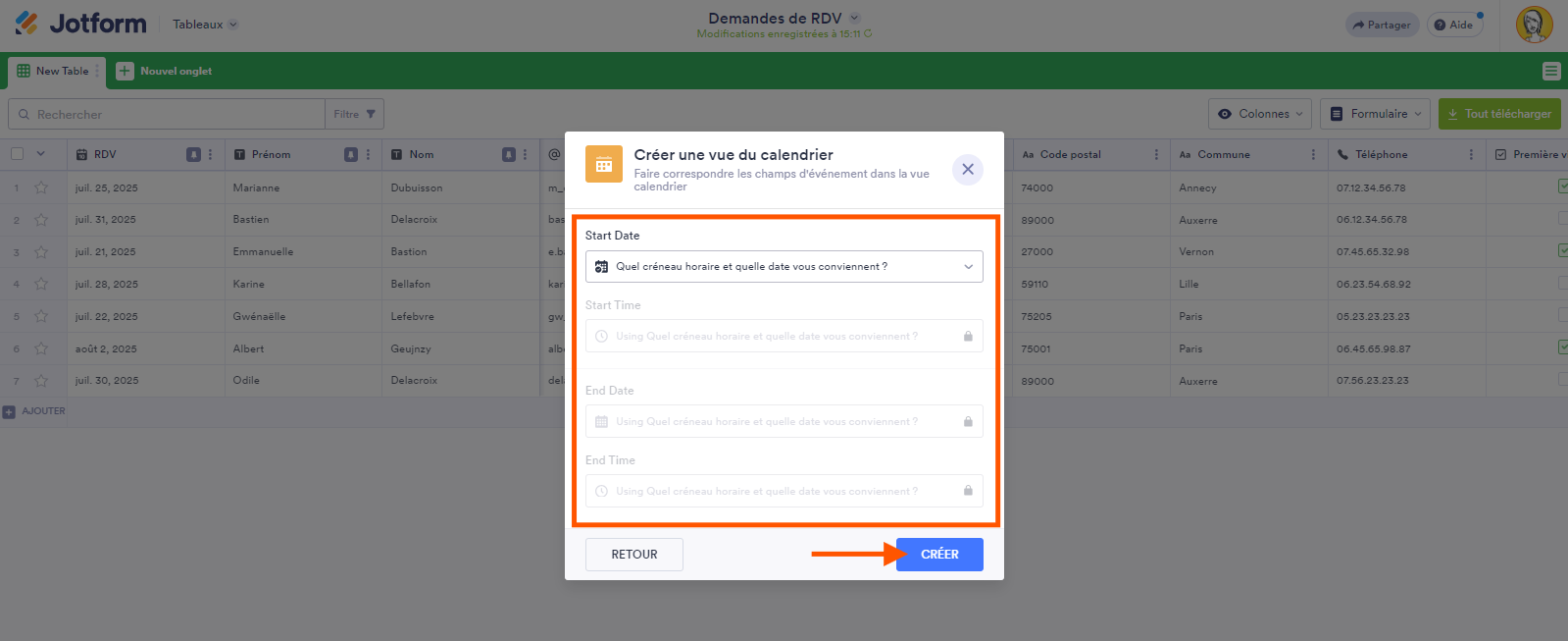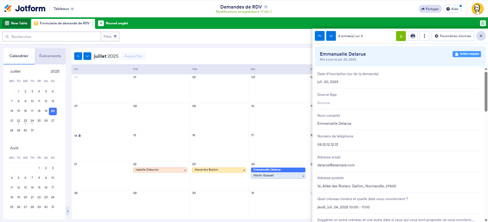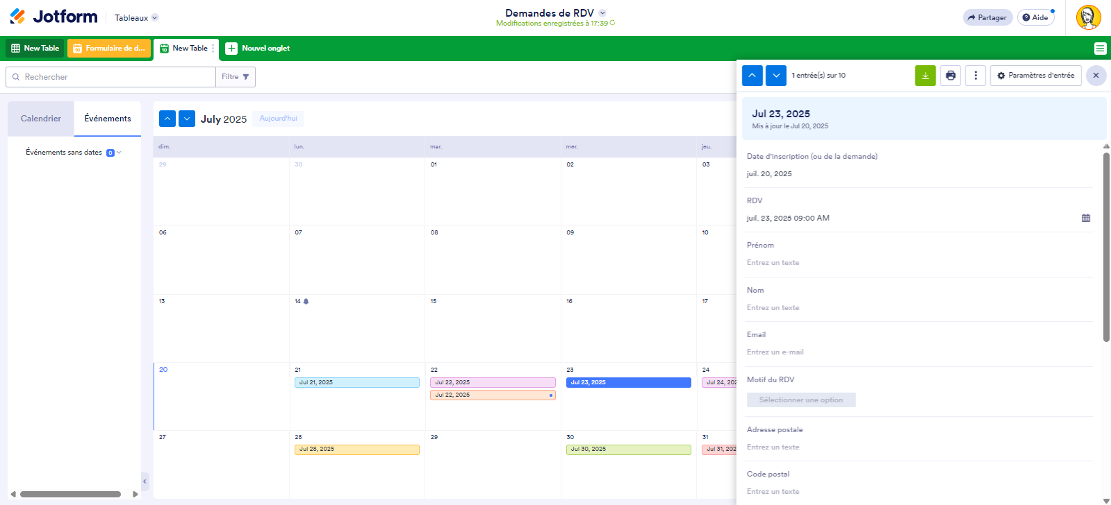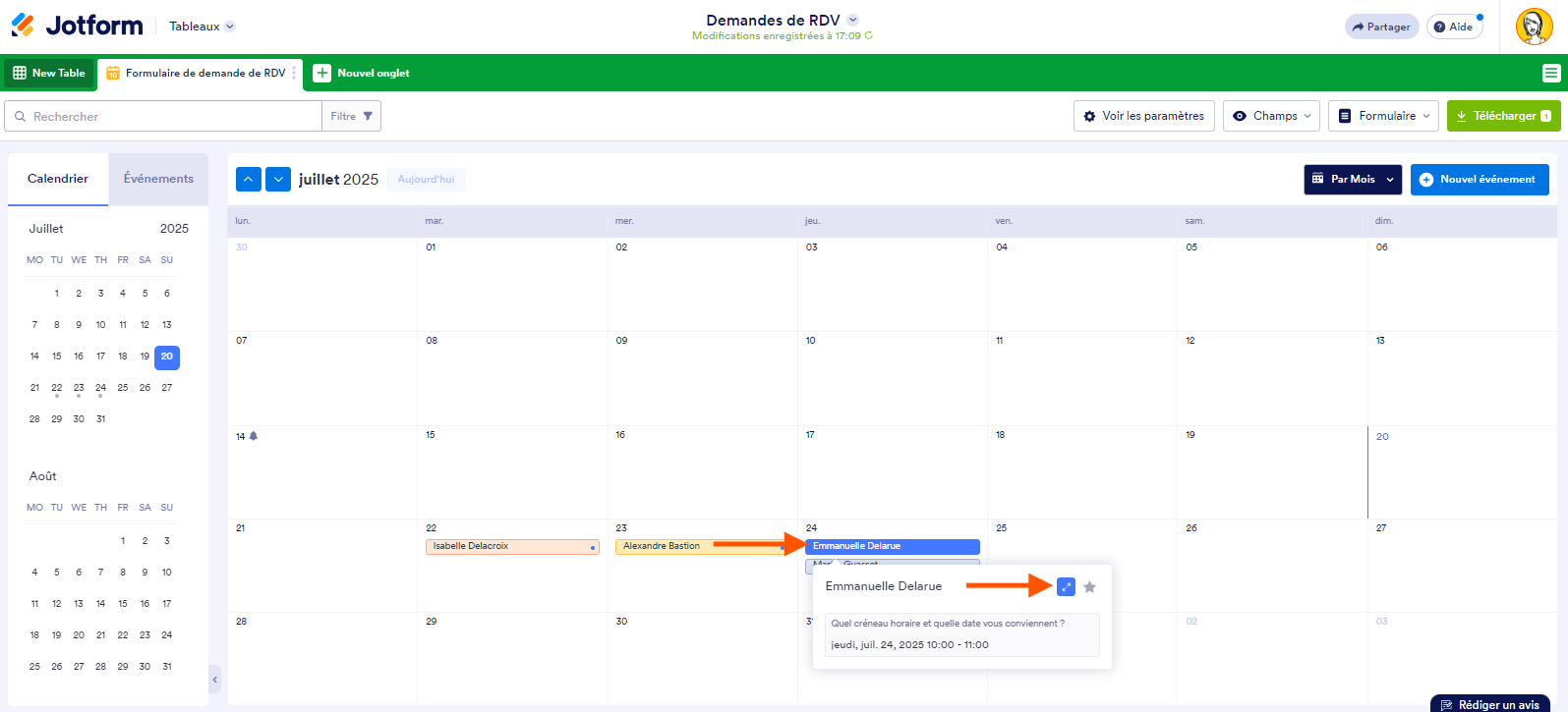 Si la personne qui a pris ce rendez-vous vous contacte pour définir la date de son rendez-vous, vous pouvez simplement glisser-déposer son entrée sur le bloc de date spécifique dans le calendrier au lieu de modifier sa soumission.