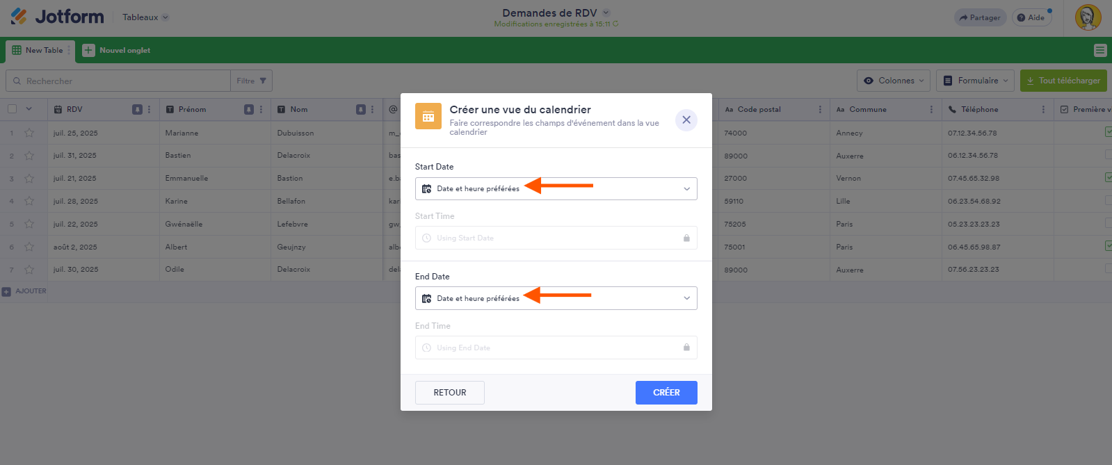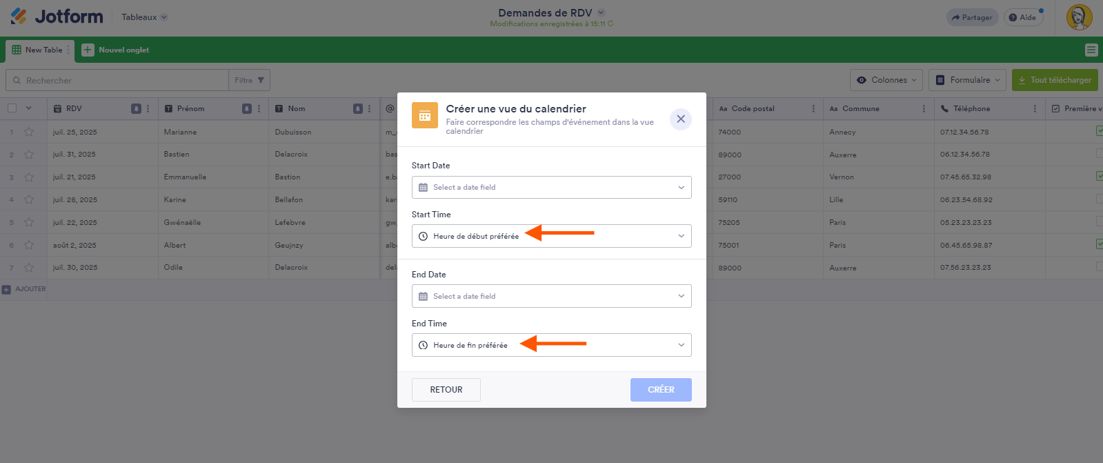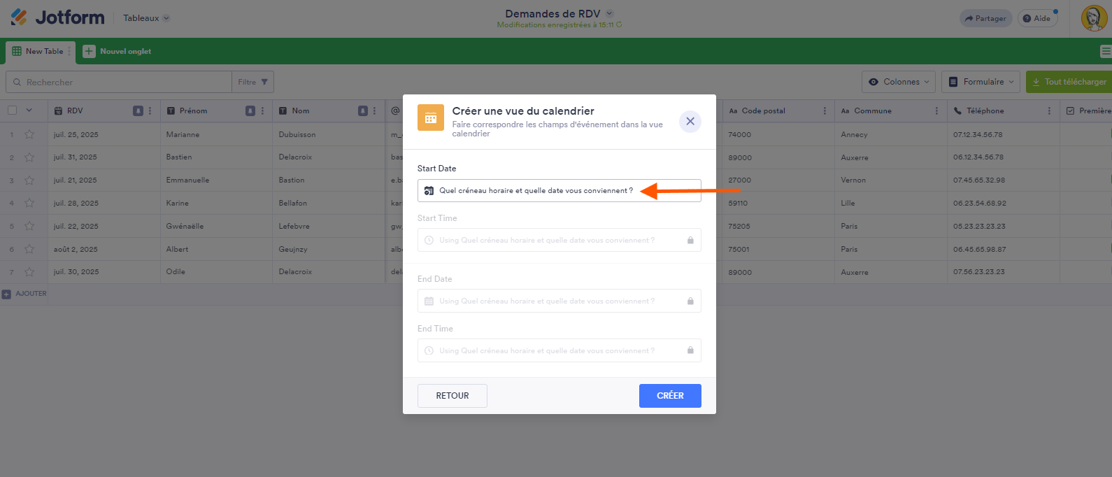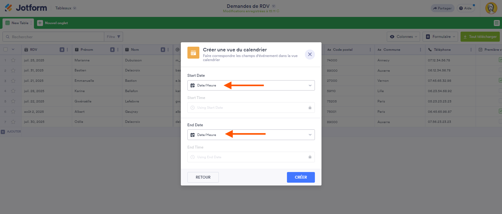 Vous pouvez ajouter des colonnes de date et d’heure à votre tableau des soumissions et les faire correspondre une par une aux champs de date et d’heure de votre événement.