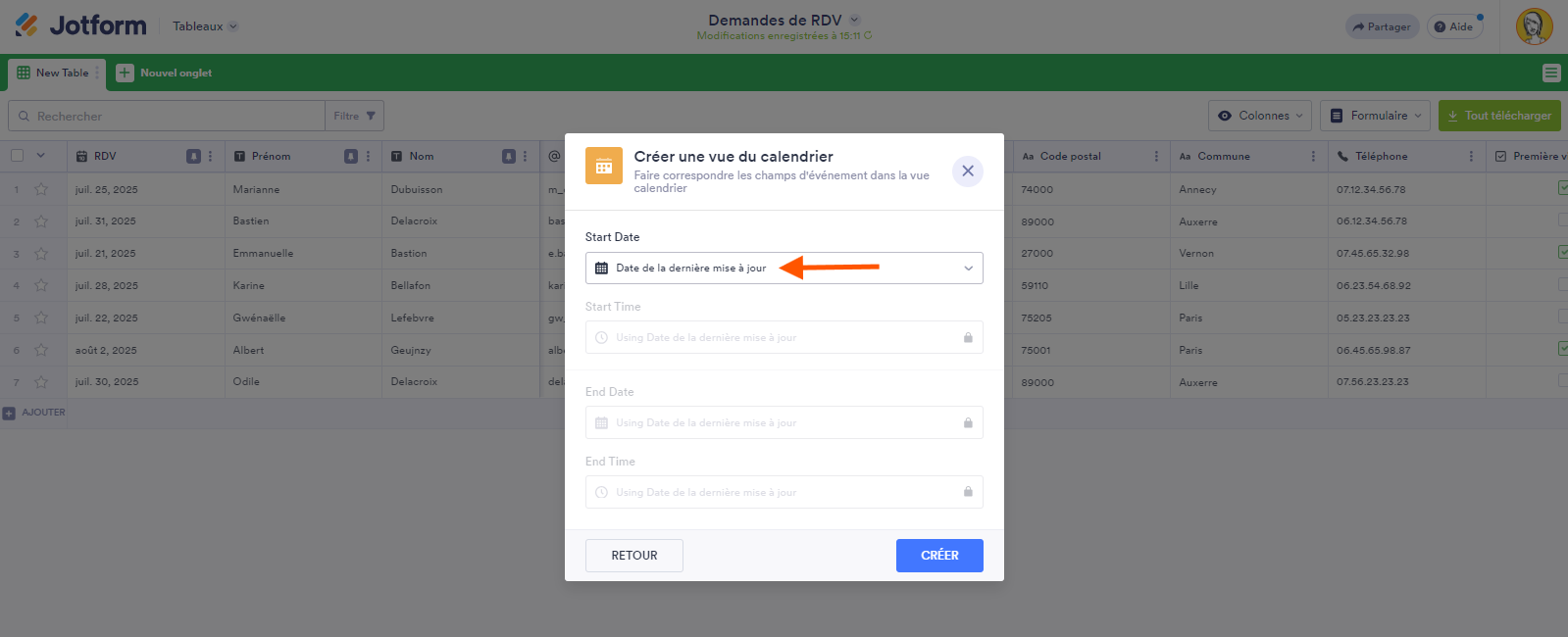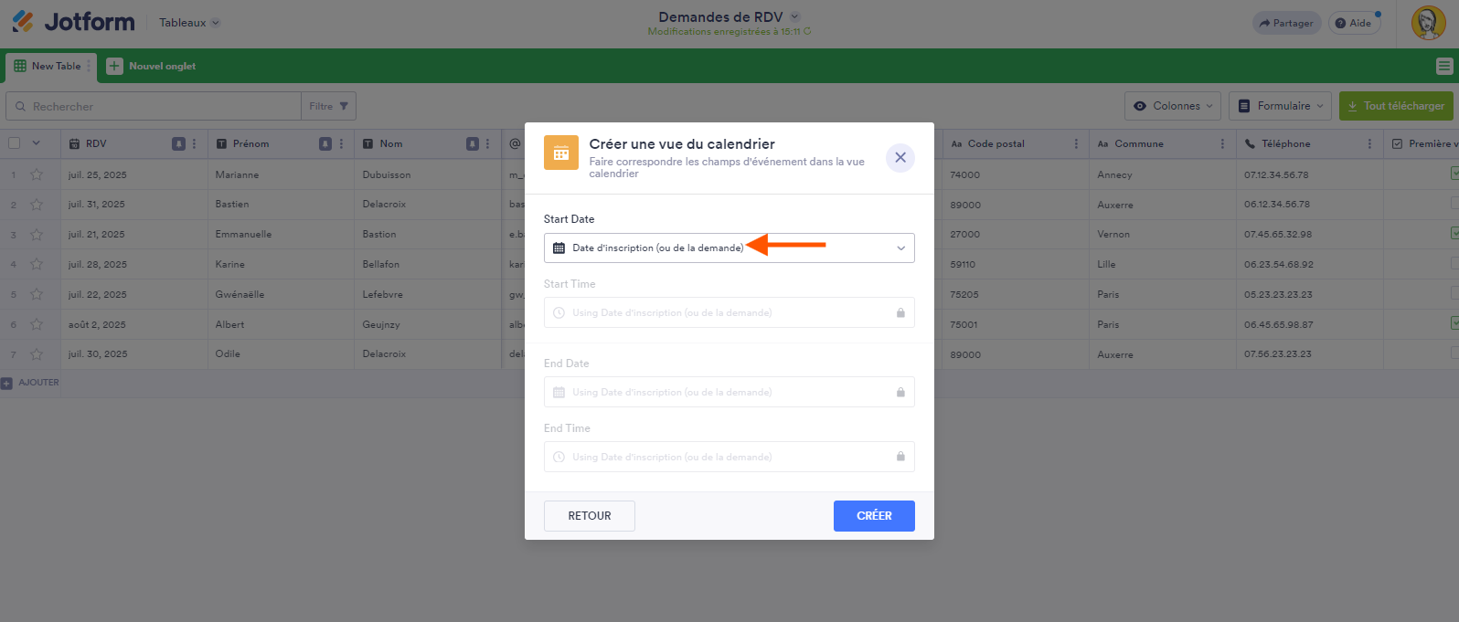 Seuls les champs de formulaire de rendez-vous de base, Date et Heure, ainsi que les colonnes Date et Heure, Date de la demande, et Date de la dernière mise à jour de votre tableau de soumissions peuvent être associés aux champs de date d’un événement dans la fenêtre Créer une vue de calendrier. Le calendrier utilisera la Date de début et l’Heure de début pour indiquer le commencement de l’événement, et la Date de fin et l’Heure de fin pour indiquer lorsqu’il se termine.