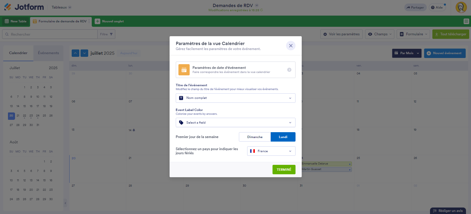 Reconfigurez les Paramètres de date d’événement, sélectionnez le champ Titre de l’événement approprié, définissez le Premier jour de la semaine (vous avez le choix entre dimanche ou lundi) et Sélectionnez un pays pour indiquer les jours fériés correspondants. Cliquez sur le bouton Terminé pour enregistrer vos modifications.