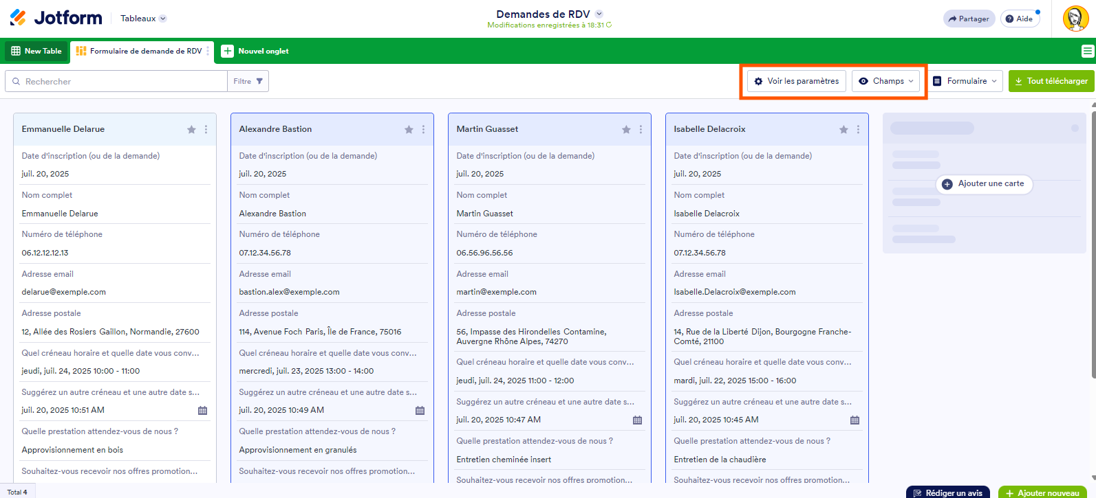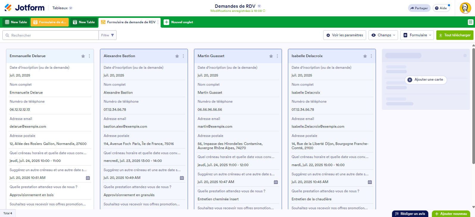 Une vue en Cartes dans Jotform Tables affiche vos soumissions de formulaire sous forme de grille. Cela vous permet de consulter rapidement les données de chaque soumission. Vous pouvez également afficher de manière sélective certains champs de chaque carte pour obtenir un aperçu rapide des informations dont vous avez besoin.