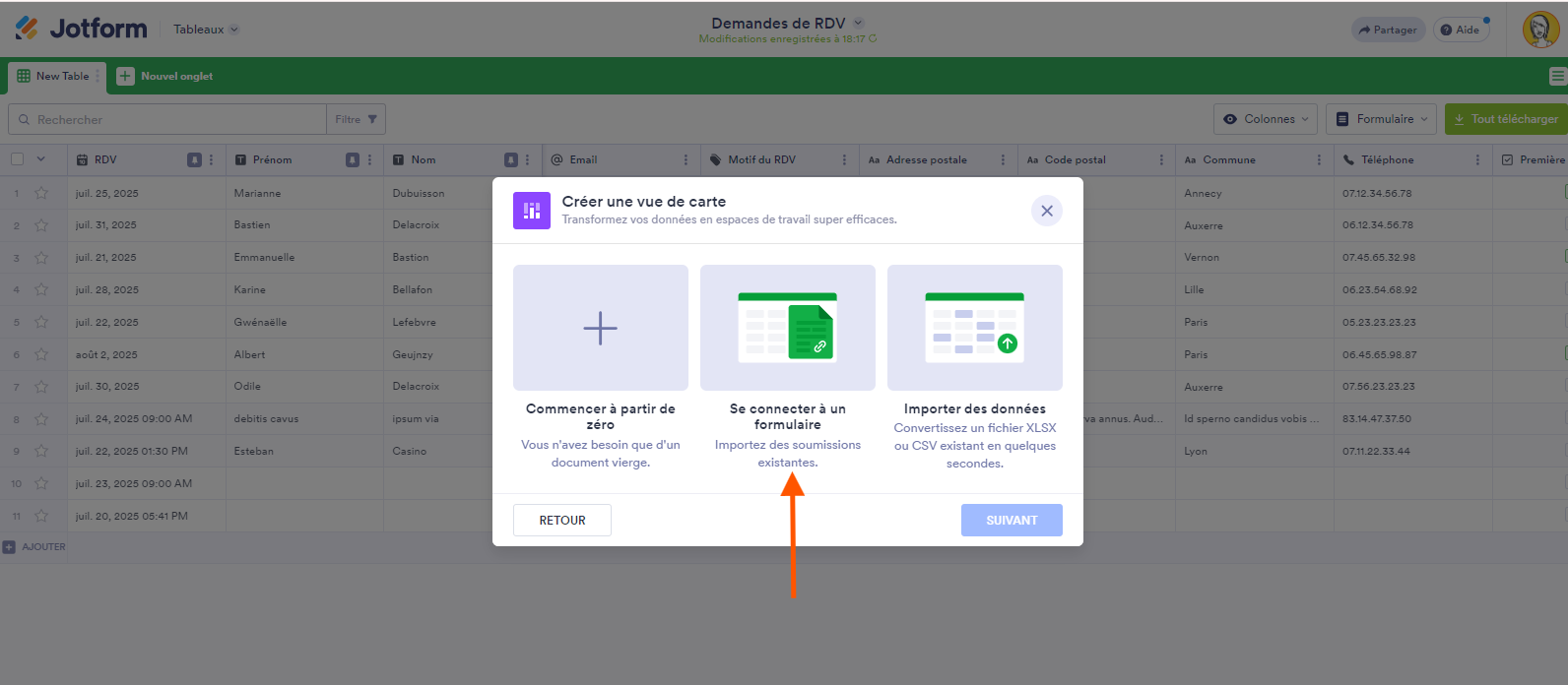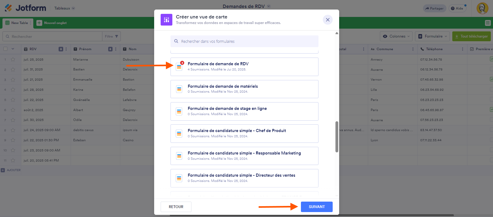- Sélectionnez le tableau de formulaire que vous souhaitez utiliser, puis cliquez sur le bouton Suivant.