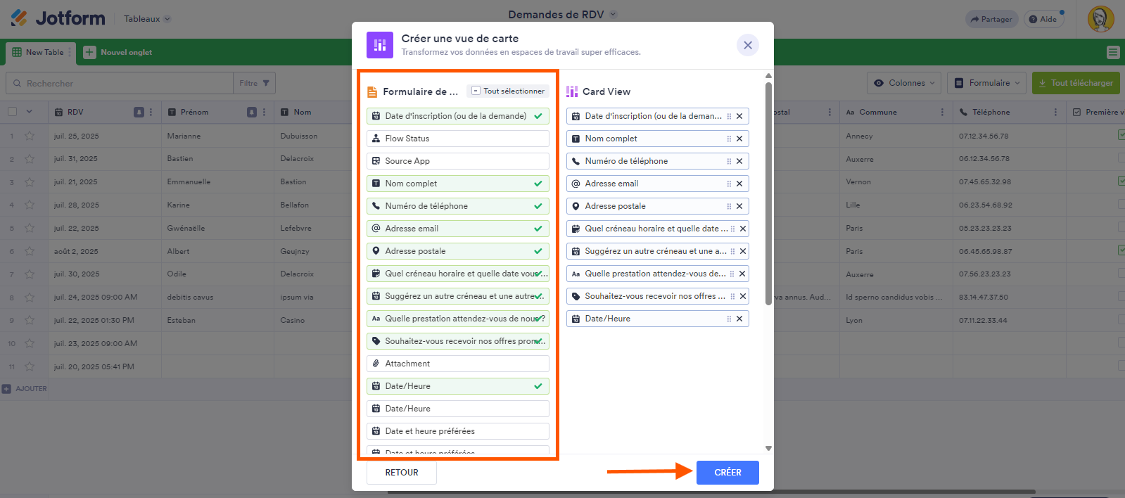 - Choisissez les champs que vous souhaitez afficher sur les cartes, puis cliquez sur le bouton Créer.