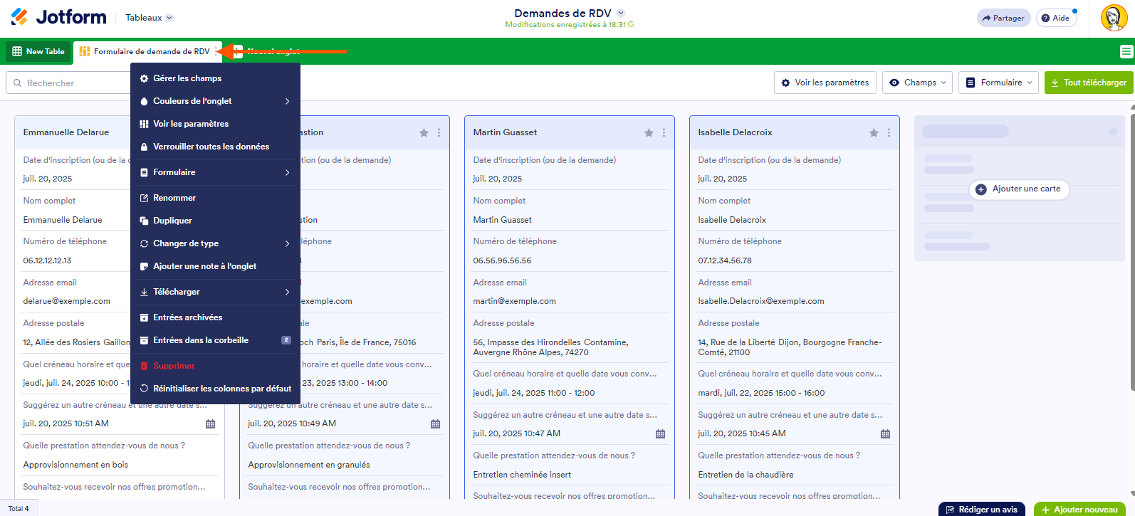 - Accédez à votre tableau dans les Tableaux Jotform, puis cliquez sur Nouvel Onglet en haut.