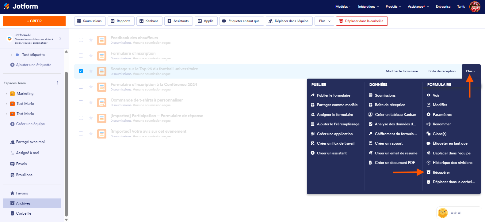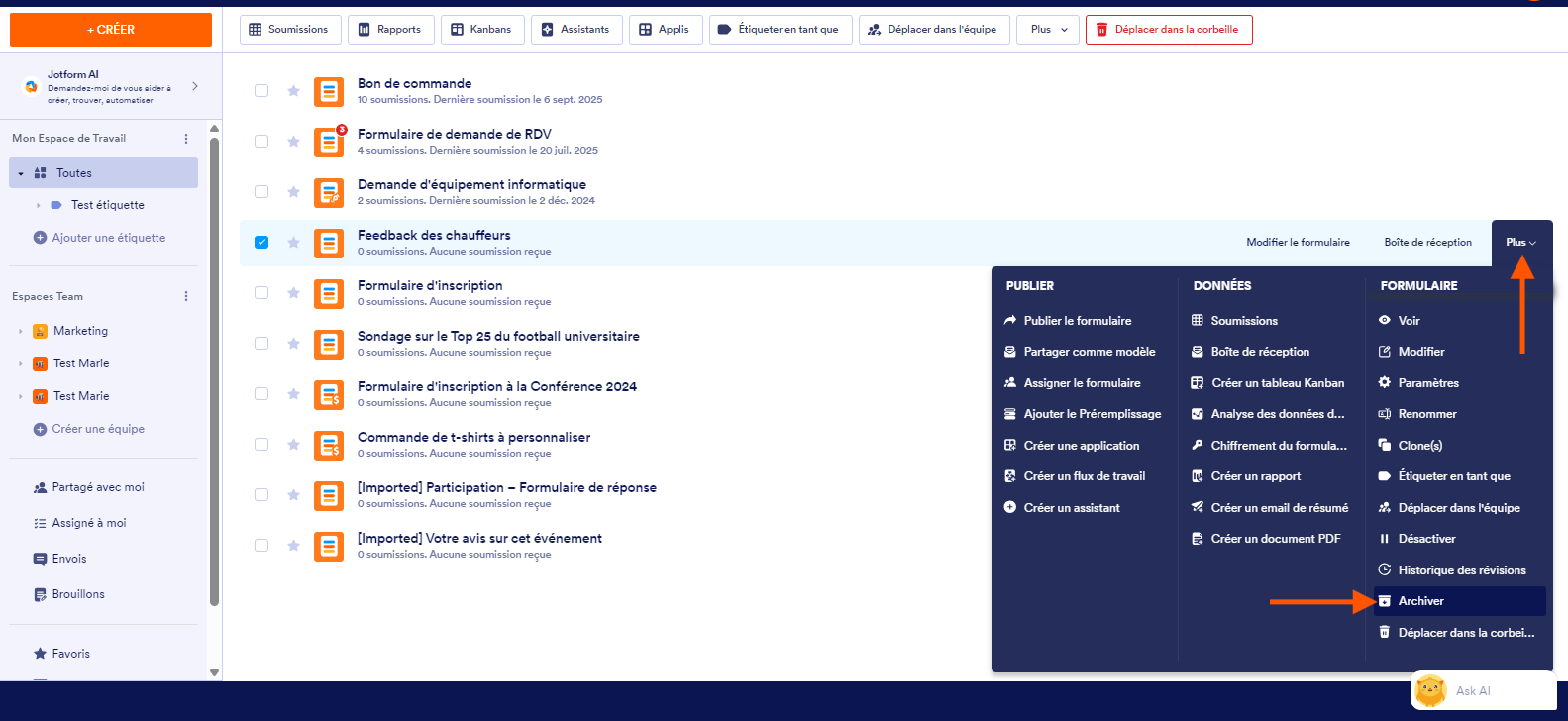 - Dans la liste déroulante Plus qui s’ouvre, sous la colonne Formulaire, cliquez sur Archiver.