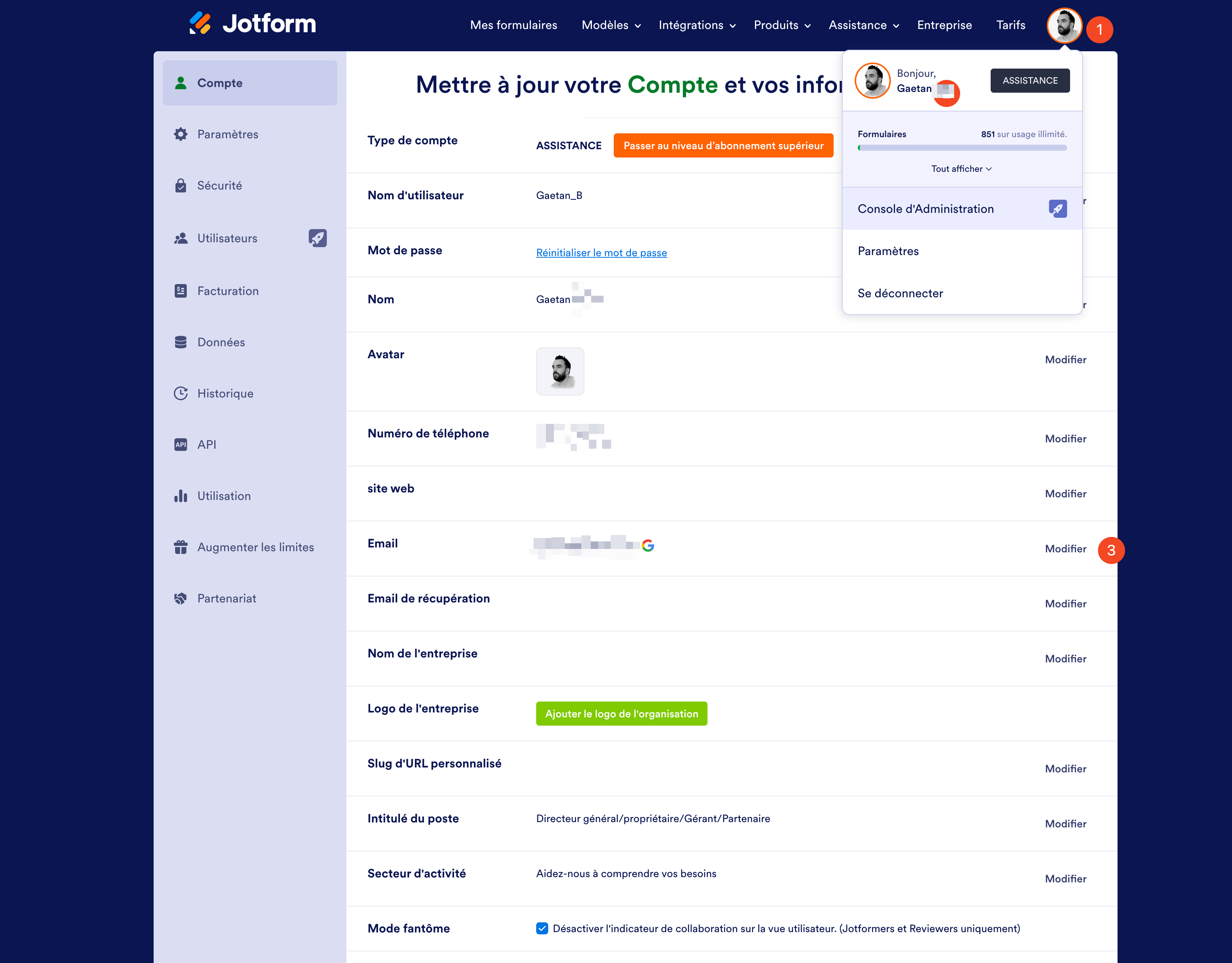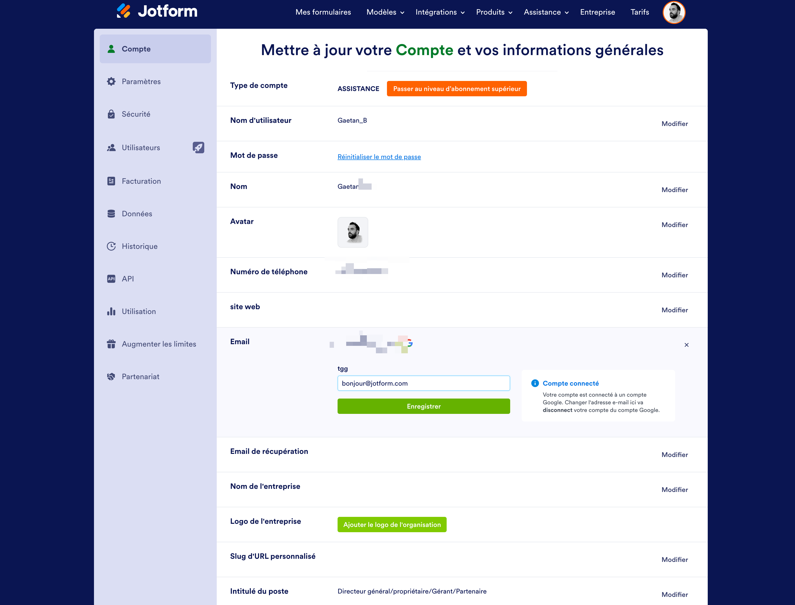 Lorsque vous vous inscrivez à un compte Jotform, il vous sera demandé de fournir votre adresse e-mail. Si vous vous êtes inscrit avec votre compte Google ou Facebook, Jotform utilisera votre adresse Gmail ou l’adresse e-mail enregistrée avec Facebook comme adresse e-mail principale. Tous les e-mails de Jotform, y compris les alertes e-mail de vos formulaires, sont envoyés à votre adresse e-mail. Si vous souhaitez changer l’adresse e-mail de votre compte, suivez les étapes ci-dessous.