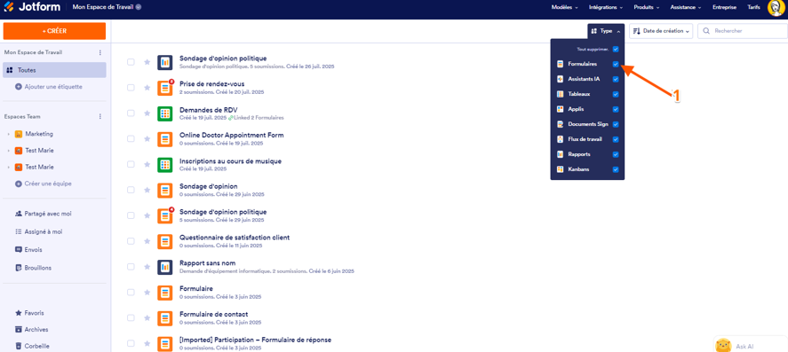 - Sur la page Mon espace de travail, cliquez sur Type en haut de l’écran, puis dans la liste déroulante qui s’affiche, décochez toutes les cases sauf celle des Formulaires, afin que seuls ces derniers s’affichent sur la page.