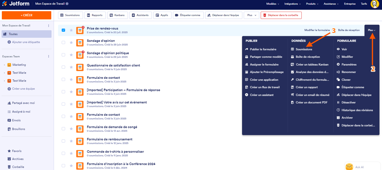 3. Ensuite, dans la liste déroulante, sous la colonnes Données, cliquez sur Soumissions.
