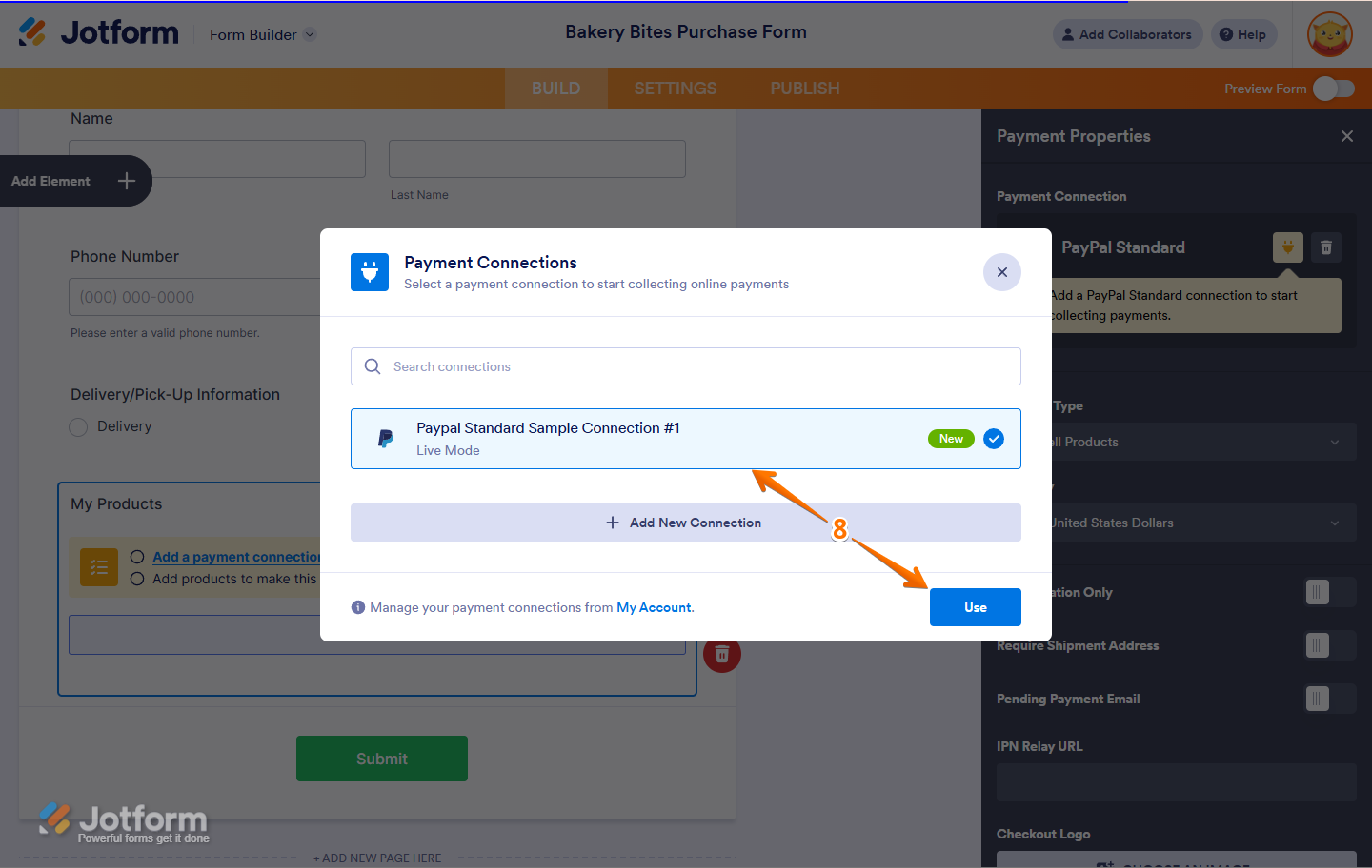 - Dans la fenêtre modale Connexions de paiement, cliquez sur la connexion PayPal Standard que vous venez d’ajouter, puis cliquez sur le bouton Utiliser en bas.
