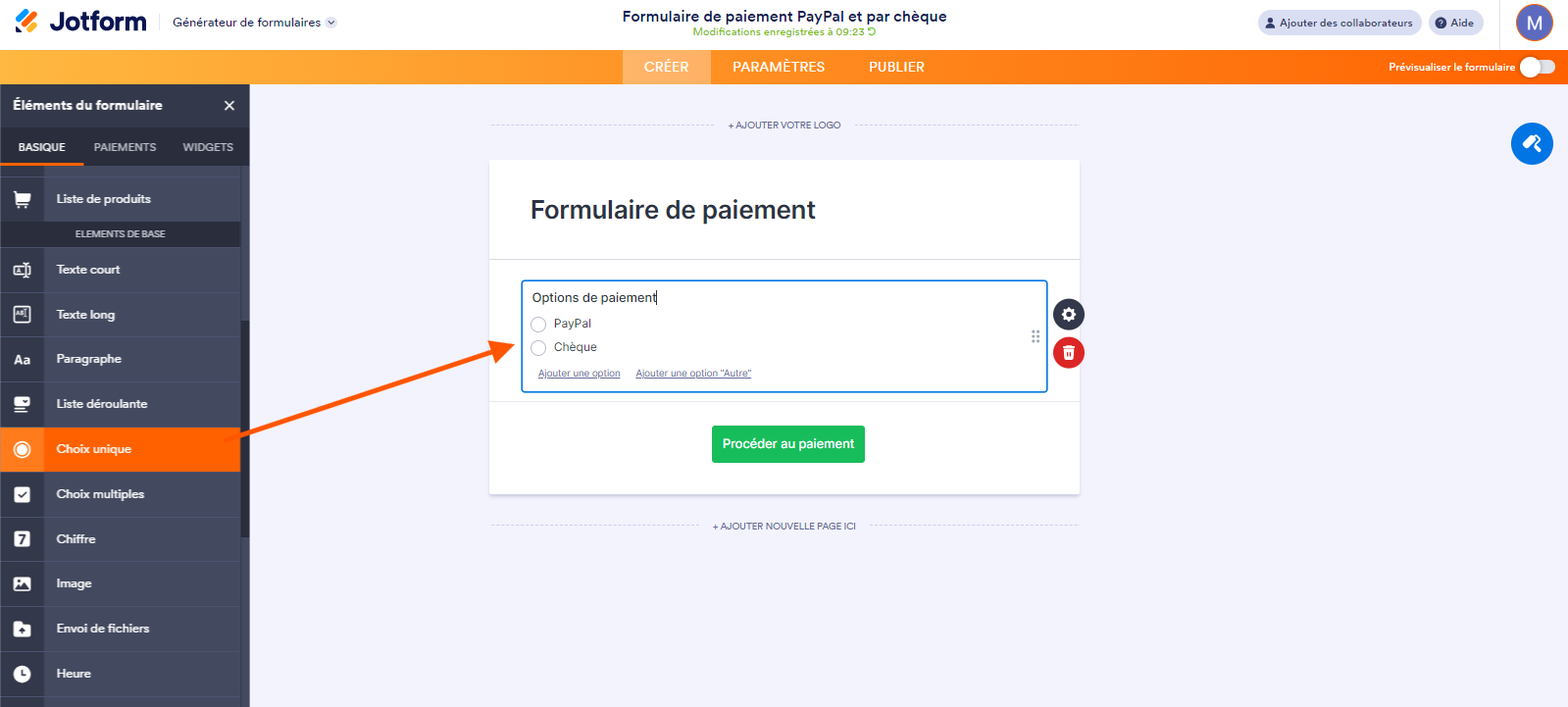- Accédez à votre formulaire dans le Générateur de formulaires Jotform. Cliquez sur Ajouter un élément + et sous l’onglet Basique, dans la catégorie Éléments de base, cliquez sur l’élément Choix unique (bouton radio) pour configurer votre champ d’options de paiement. Ensuite, définissez ce champ comme obligatoire.