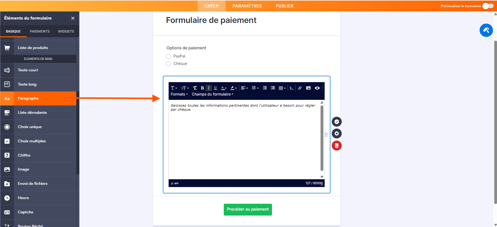 - Pour configurer l’option Chèque, ajoutez un élément Paragraphe et incluez toutes les informations pertinentes dont l’utilisateur a besoin pour régler par chèque.