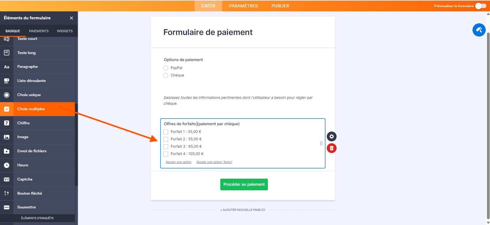 - Ensuite, utilisez un élément Choix multiples pour afficher les produits que les clients peuvent payer par chèque.